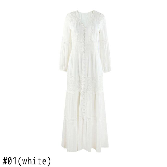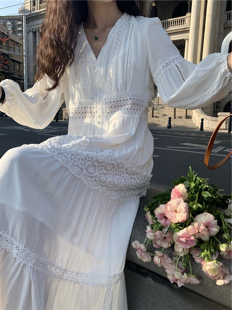 [EWQ] V ネックフックフラワー中空ドレスソリッドシングルブレストドレス春夏オールマッチ服 スプリング 春物 サマー 夏物 Vネック ソリッドカラー フラワーデザイン
