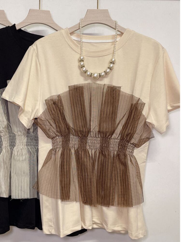 [EWQ] メッシュパッチワークフェイクツーピース Tシャツルーズフィットコントラストカラー因果半袖 Tシャツトップ夏 ショート ハーフスリーブ サマー 夏物