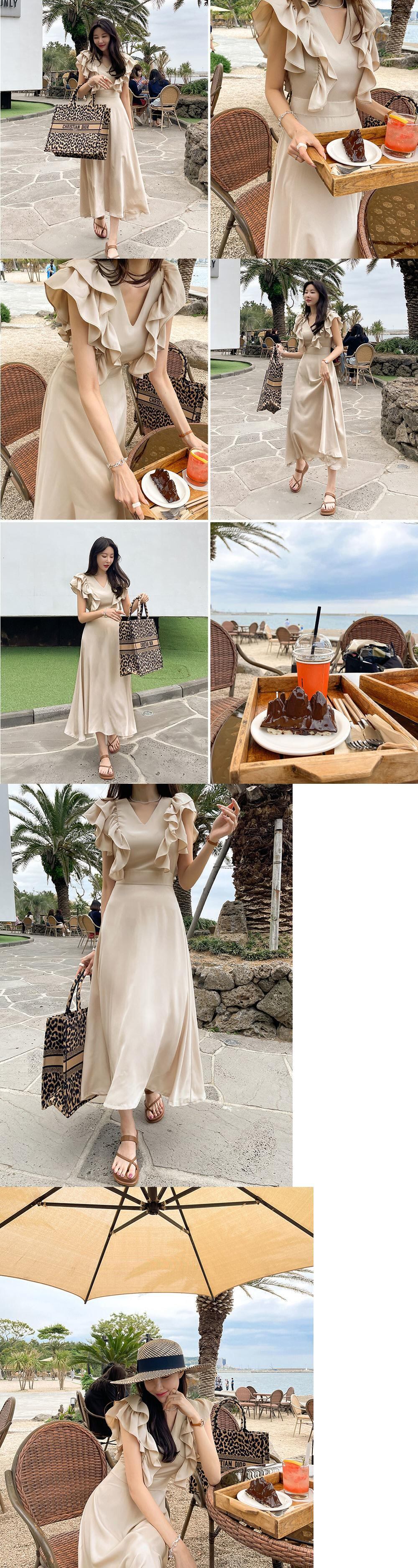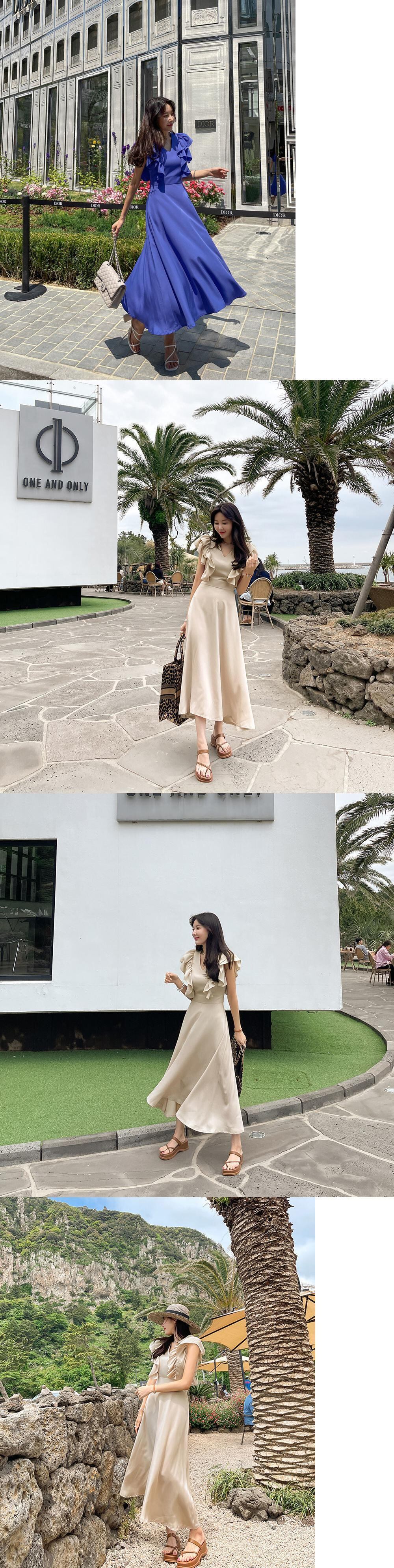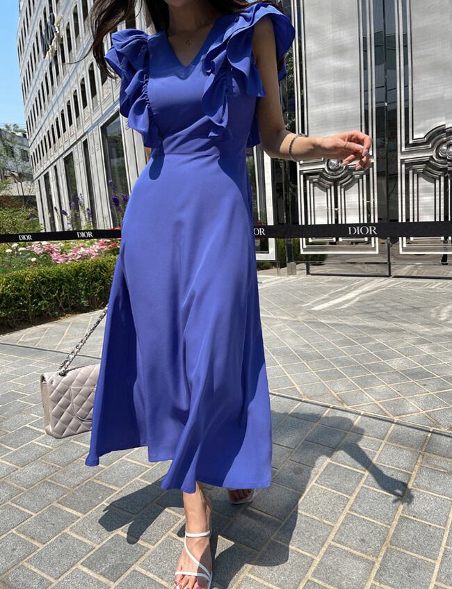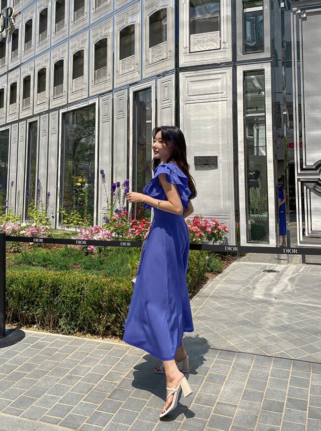 [EWQ] フリルスプライシング半袖ドレス夏潮スリムウエストブルードレス Vestido 16U118 ショート ハーフスリーブ サマー 夏物