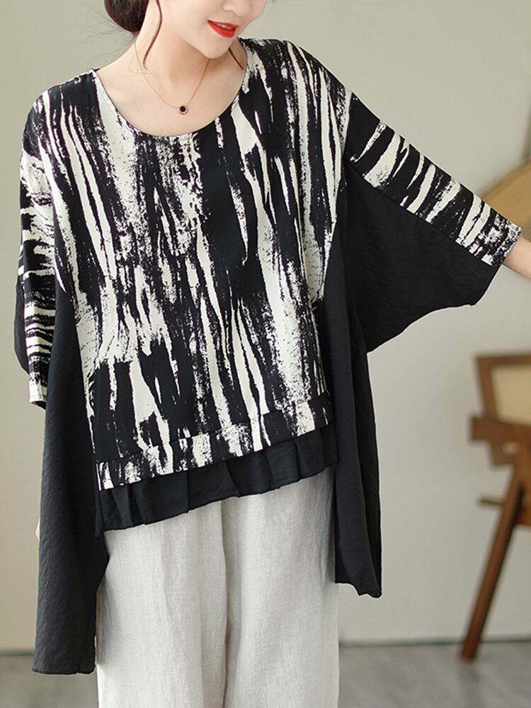 [EWQ] 中綿スリーブルーズフィットプリント Tシャツ非対称パッチワークコントラストビッグサイズ Tシャツサマートップ 夏物