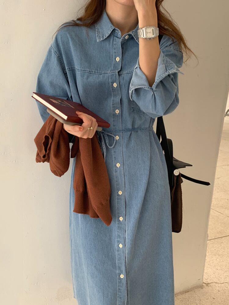 [EWQ] ラインレースアップウォッシュ長袖デニムドレスダブルブレストストレート Vestido 春秋潮服 16Y60 ロング スプリング 春物 オータム 秋物