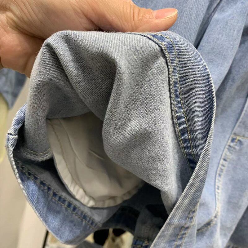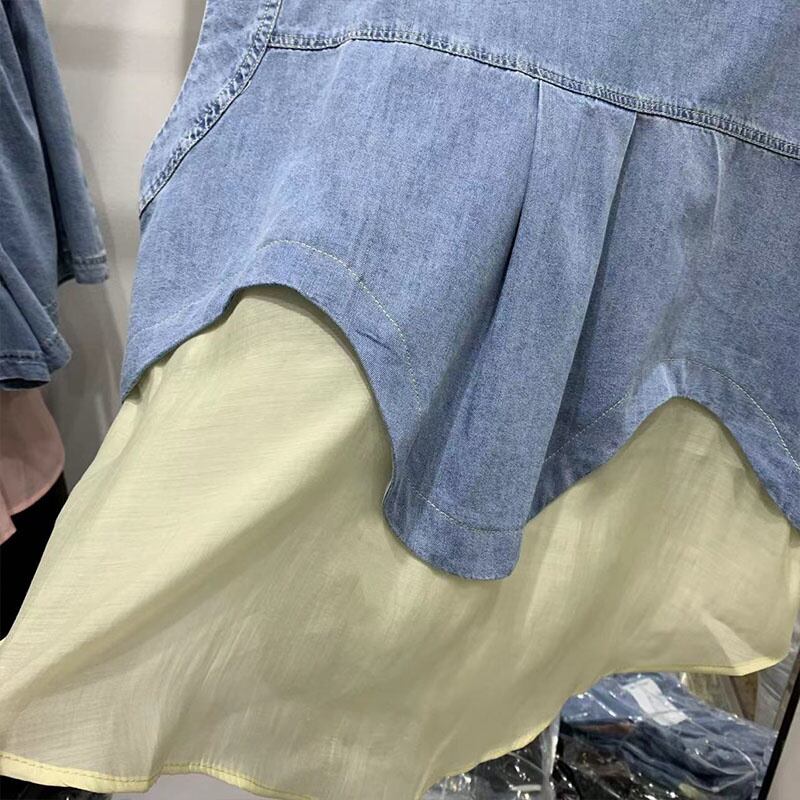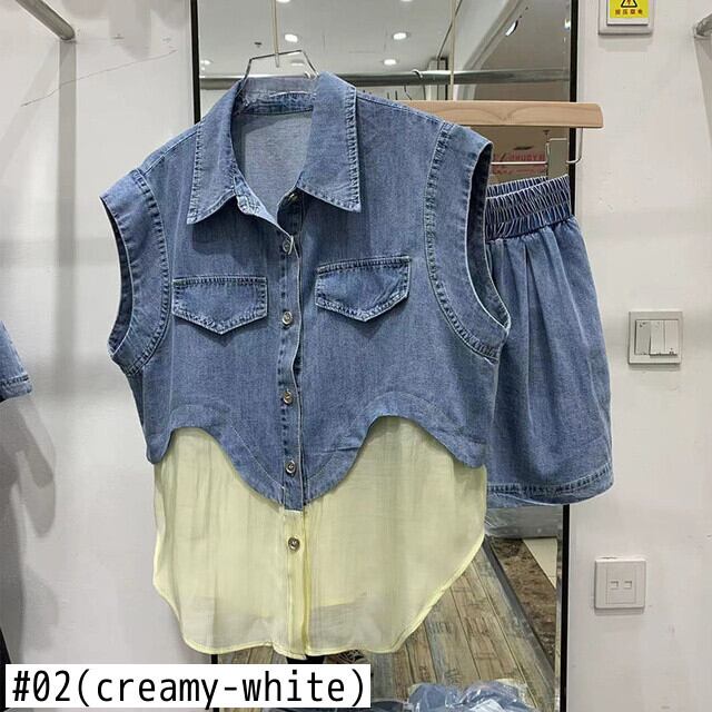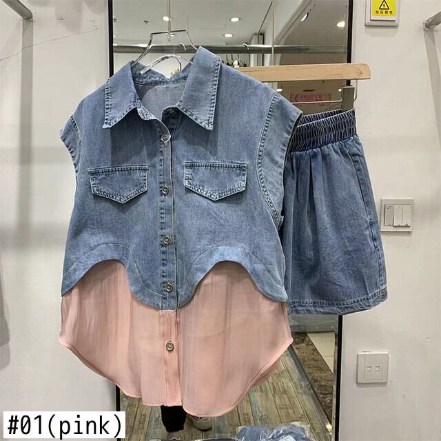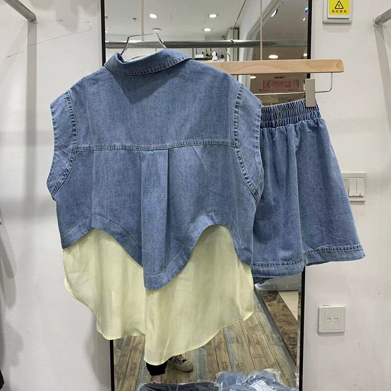 [EWQ] パッチワークスーツメッシュスプライスデニムベストウエストワイドレッグショーツ夏潮シングルブレストトップ 16Y9844 サマー 夏物 ブルマー ワイドパンツ