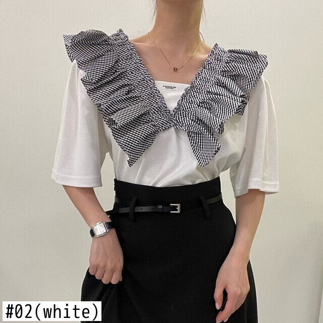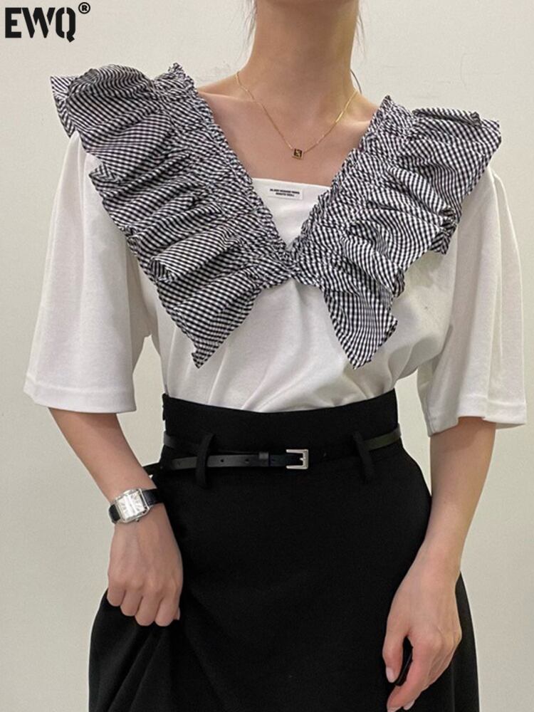 [EWQ] V ネックカラーコントラスト Tシャツステッチフリルスプライス半袖 Tシャツトップ夏潮トップス Y8989 ショート ハーフスリーブ サマー 夏物 Vネック