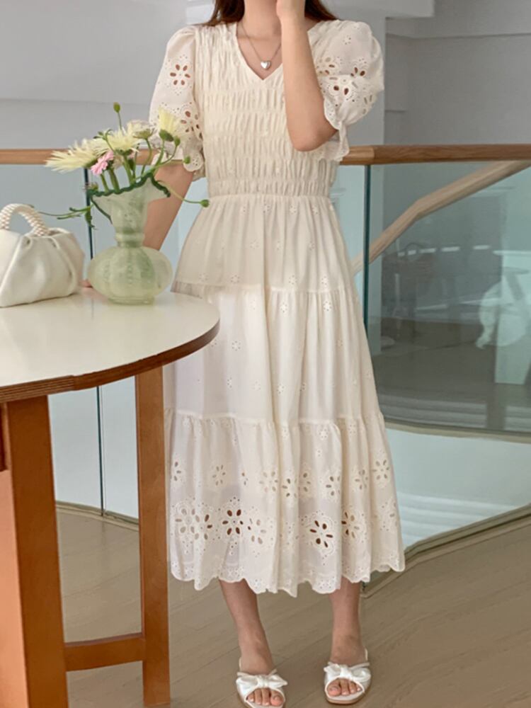 [EWQ] 甘いピンクドレス半袖フックフラワー中空 V ネックプリーツドレス夏潮 Vestido U163 ショート ハーフスリーブ 大人ガーリー スウィート キュート カジュアル サマー 夏物 Vネック フラワーデザイン