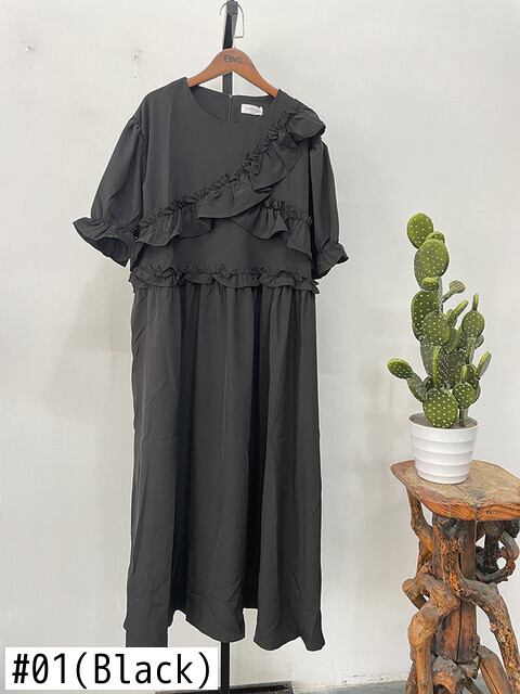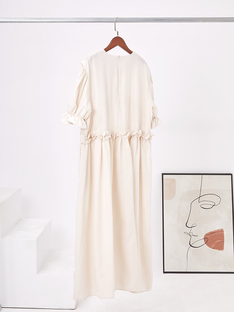 [EWQ] ソリッドカラーフリルスプライスドレスルーズフィット O ネックポケットドレス夏潮 Vestido 466 サマー 夏物 Oネック