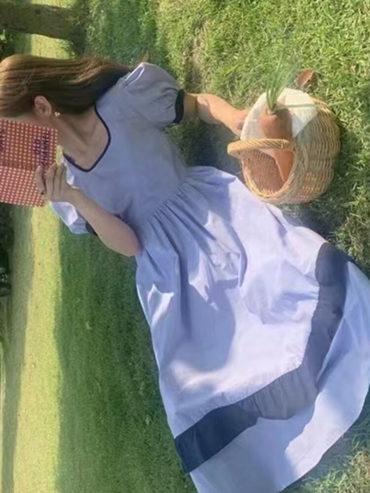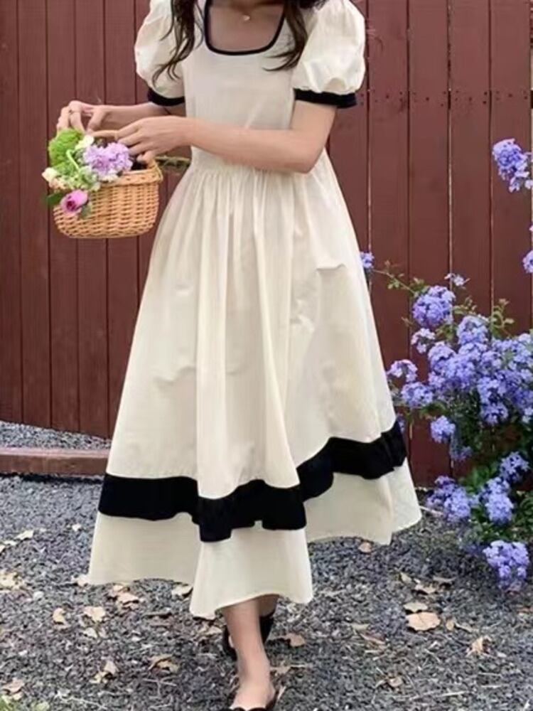 [EWQ] コントラストレースアップドレスプリーツウエストパフスリーブパッチワークドレス夏潮スクエアネック Vestido サマー 夏物 スクウェア