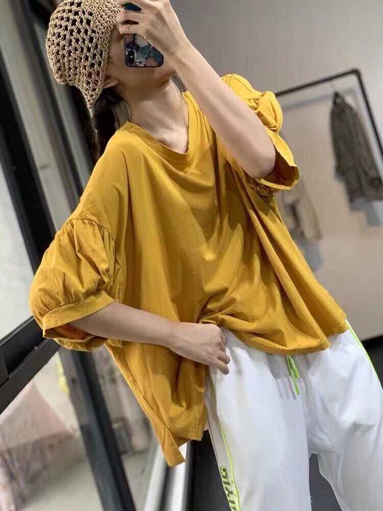 [EWQ] パープルルーズ Tシャツランタンスリーブプリーツビッグサイズ O ネック因果 Tシャツトップ夏潮 Tシャツ サマー 夏物 Oネック
