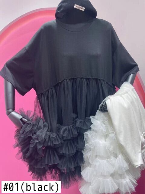 [EWQ] 甘い裾メッシュスプライシング Tシャツショートドレスパッチワーク O ネックルーズカジュアルピンクミニドレス夏 大人ガーリー スウィート キュート サマー 夏物 Oネック