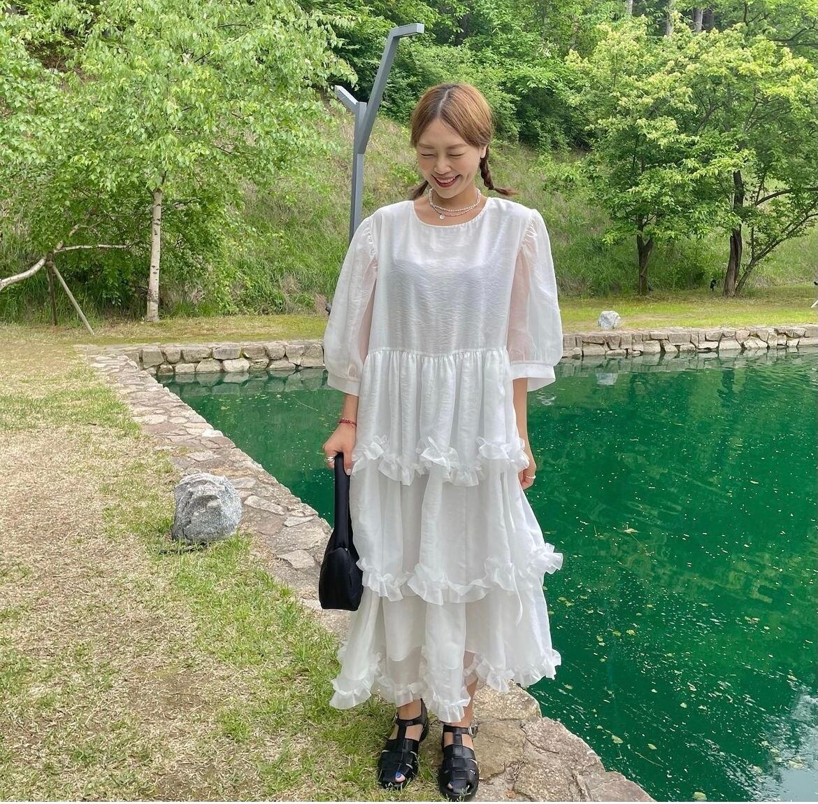[EWQ] ランタンスリーブ甘いドレスラフパッチワークピンクルーズフィット O ネックドレス夏潮レースアップ Vestido 大人ガーリー スウィート キュート カジュアル サマー 夏物 Oネック