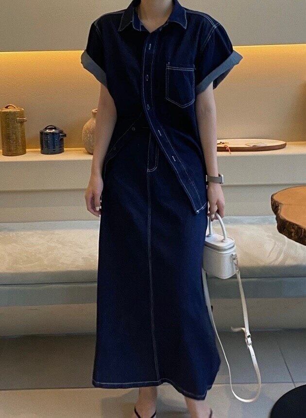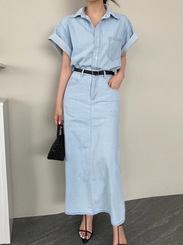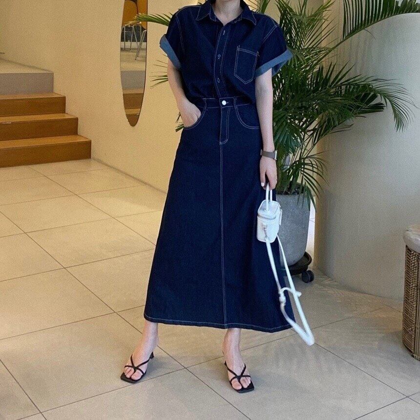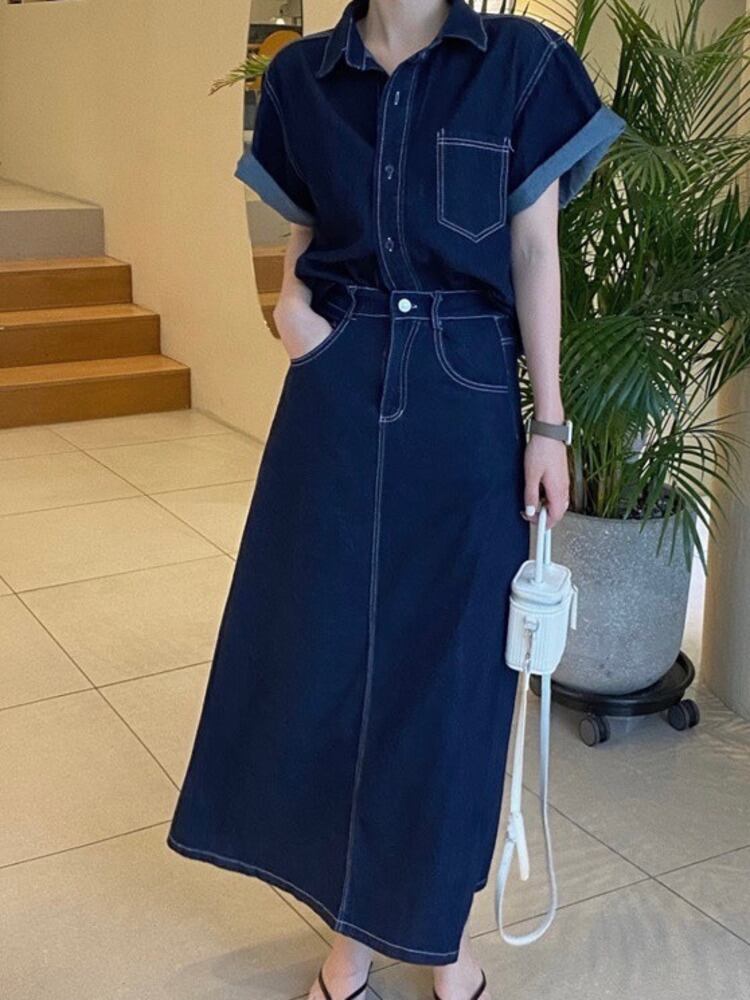 [EWQ] ブライトライン装飾スーツシングルブレストシャツ + ハイウエストポケットスカート夏潮デニムセット ハイウェスト サマー 夏物