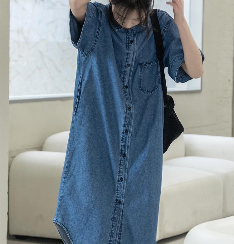 [EWQ] 半袖ストレートシャツデニムドレス夏潮ルーズフィットシングルブレストドレス Vestido ショート ハーフスリーブ サマー 夏物