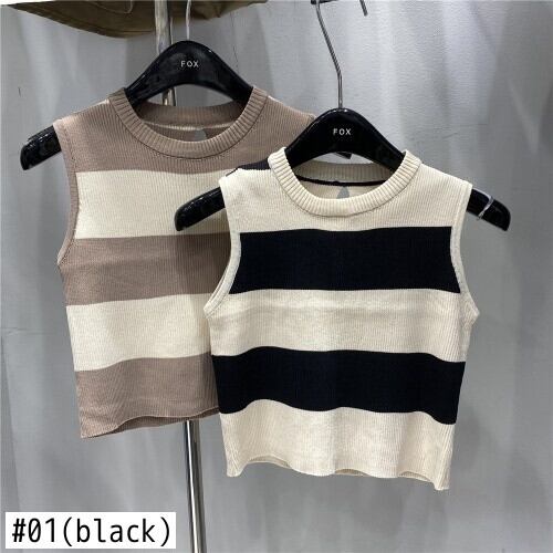 [EWQ] ブラックニットストライプタンクトップサマータイドスリムフィット O ネックノースリーブ中空アウトホールベスト 夏物 Oネック