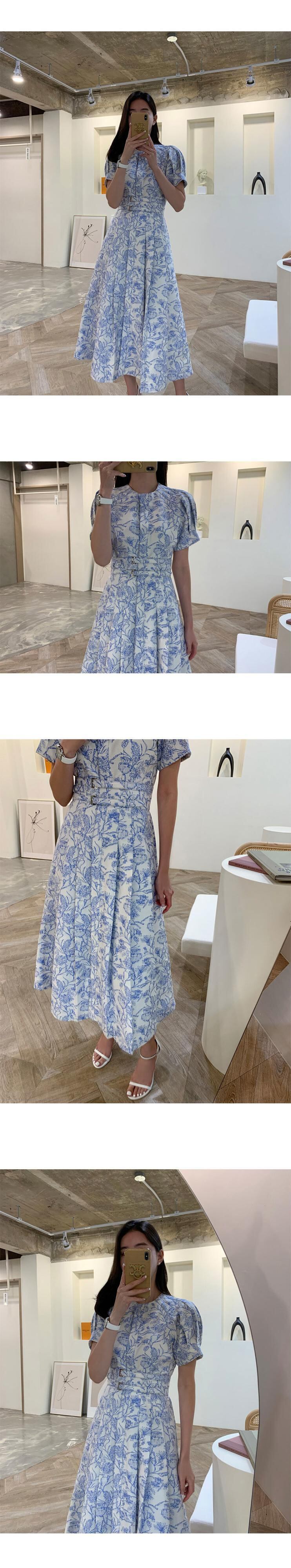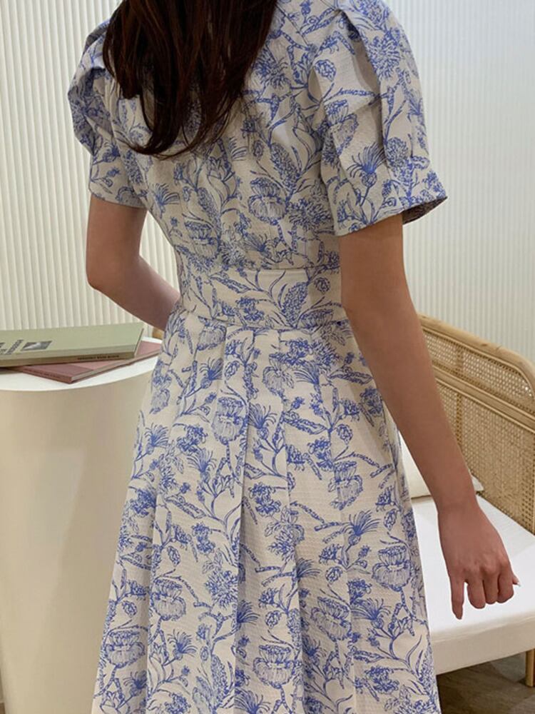 [EWQ] プリントドレスダブルレースアップウエストプリーツコントラスト半袖ドレス夏 Vestido ショート ハーフスリーブ サマー 夏物