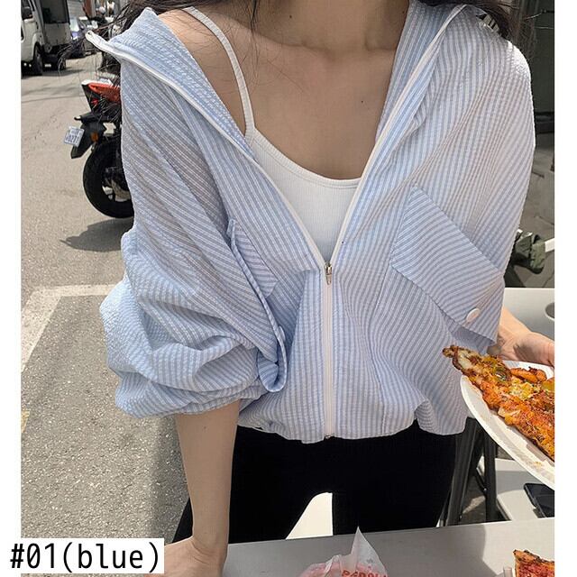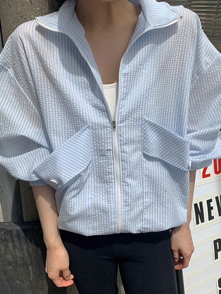 [EWQ] ストライプ薄いコートポケット長袖アウターウェアコントラストルーズジッパージャケット夏潮 ロング サマー 夏物