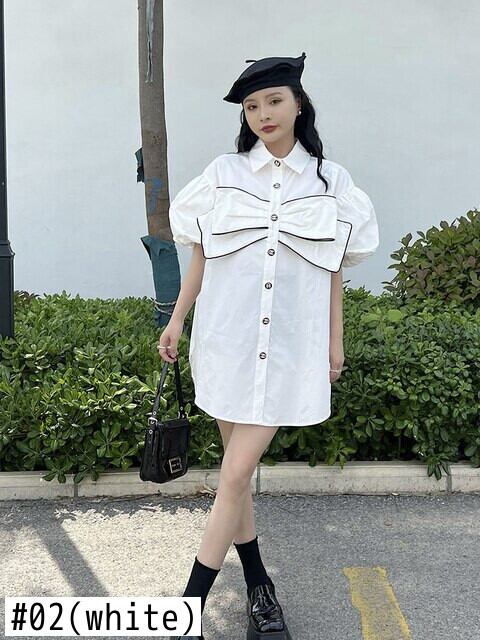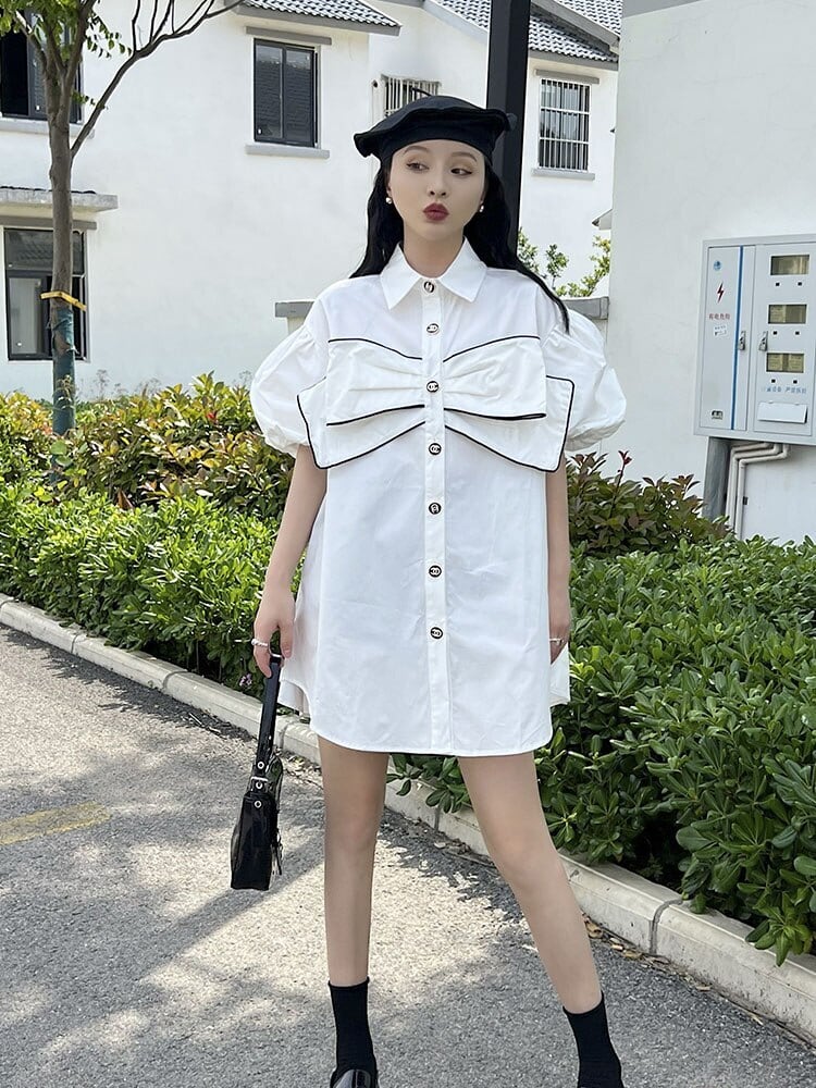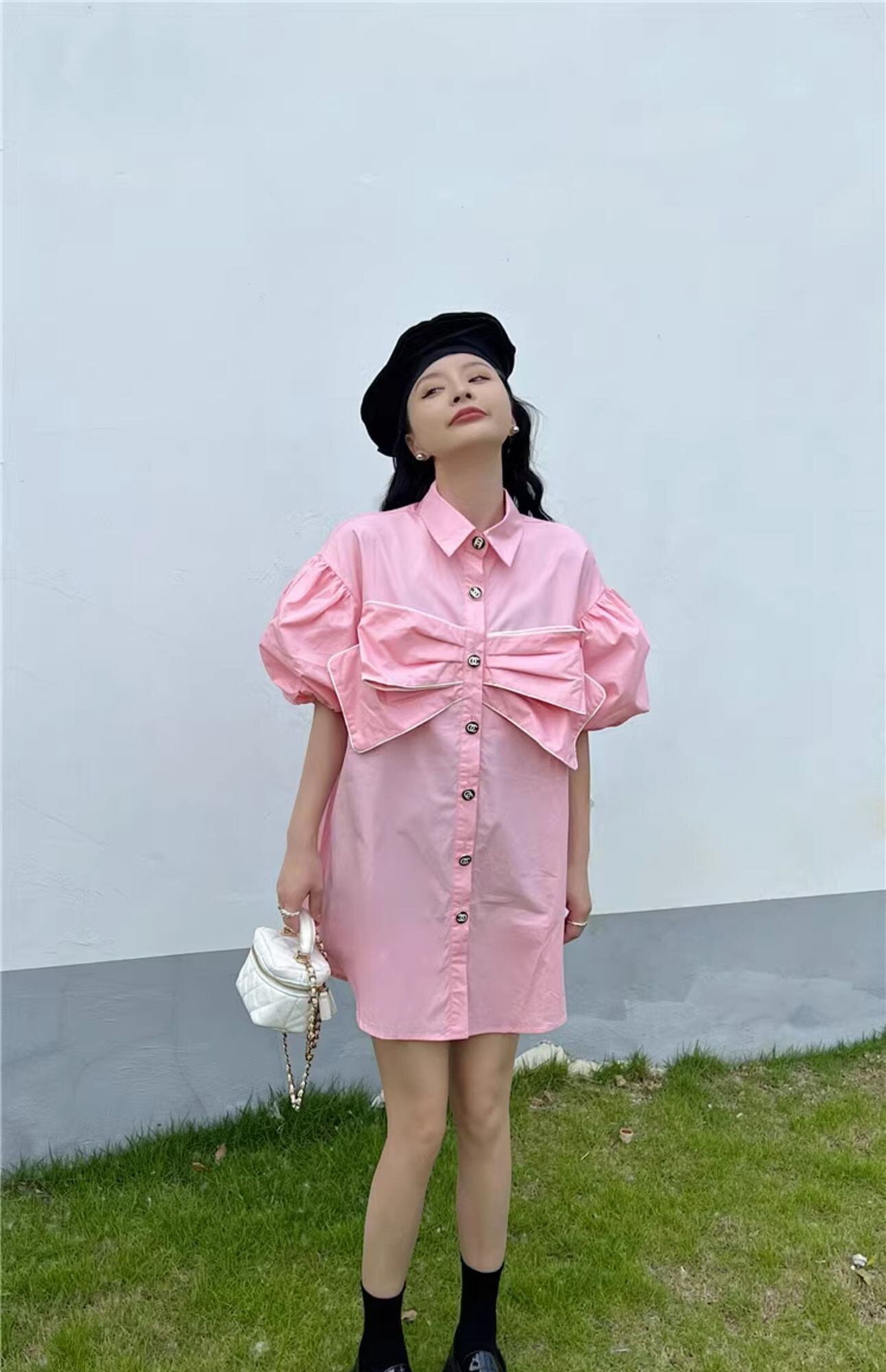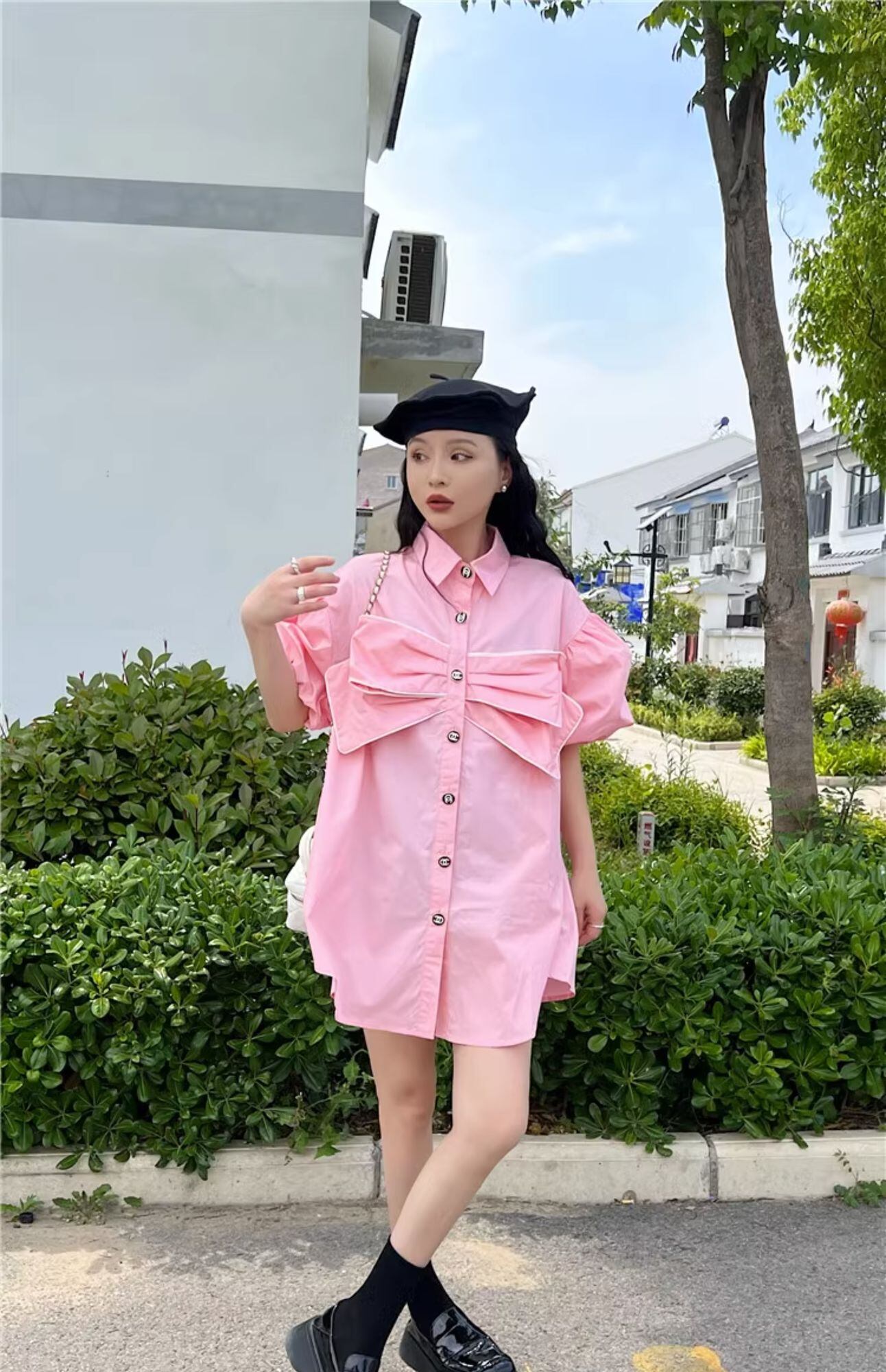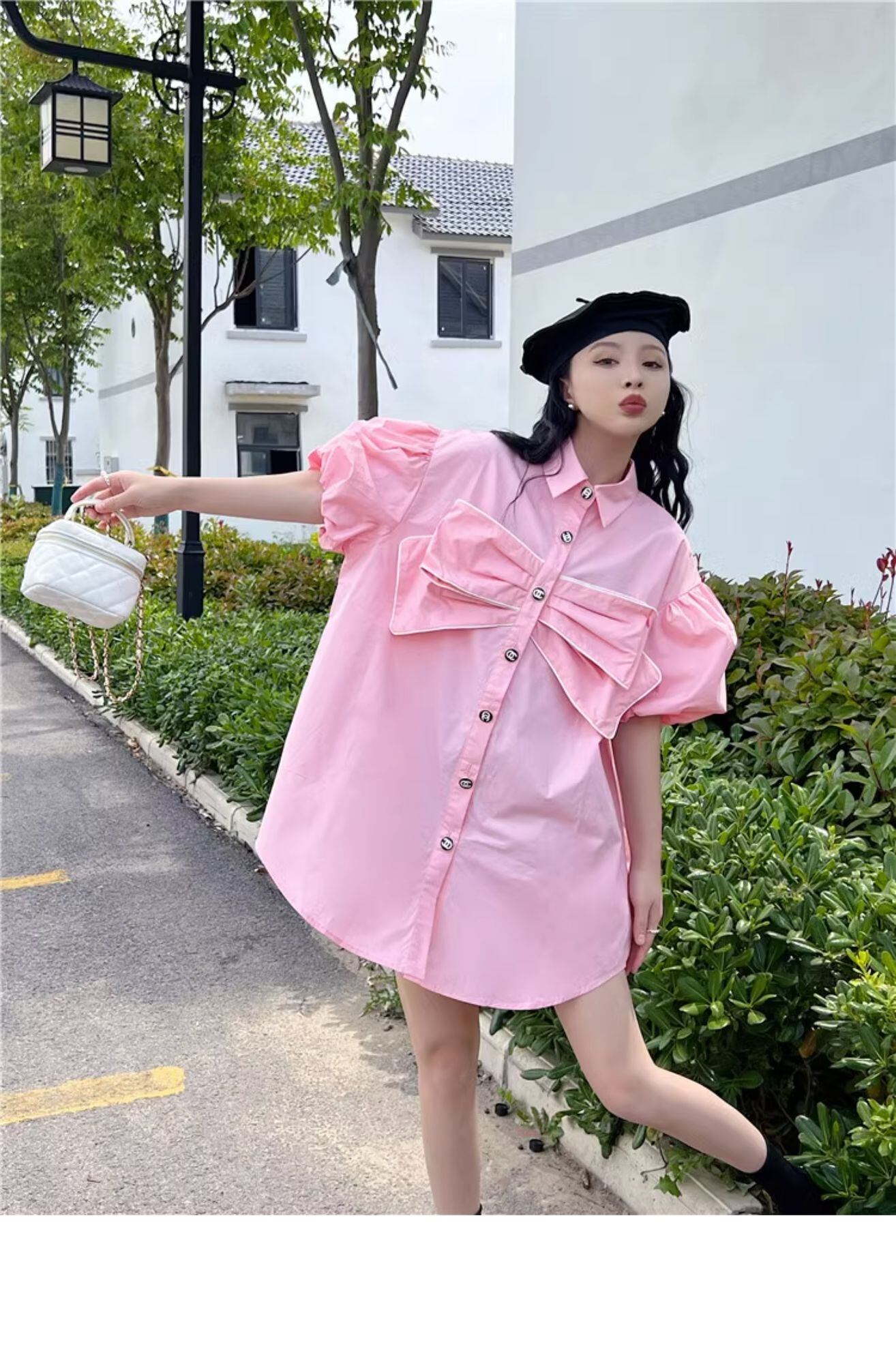 [EWQ] 甘い 3D 蝶ネクタイシングルブレストシャツルーズフィットカジュアル半袖夏潮トップ 16U192 ショート リボン ハーフスリーブ 大人ガーリー スウィート キュート サマー 夏物