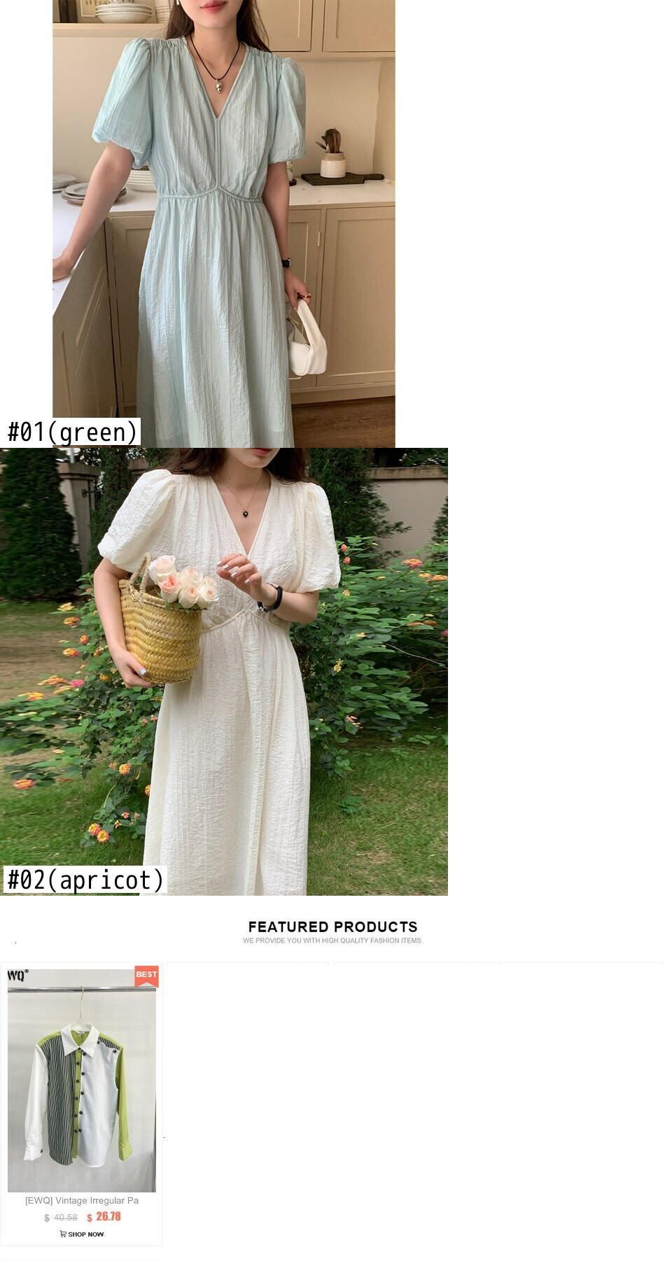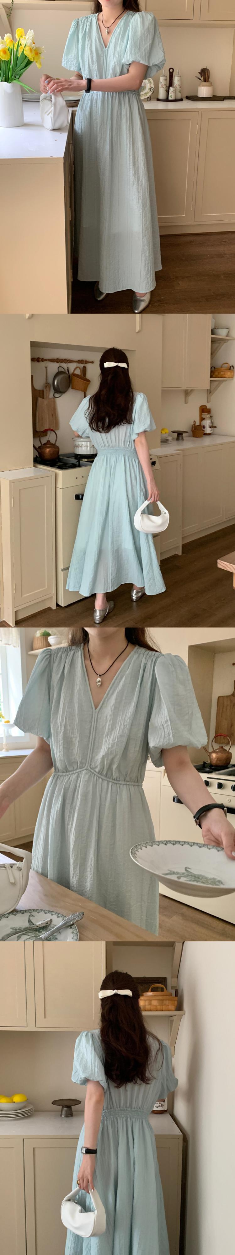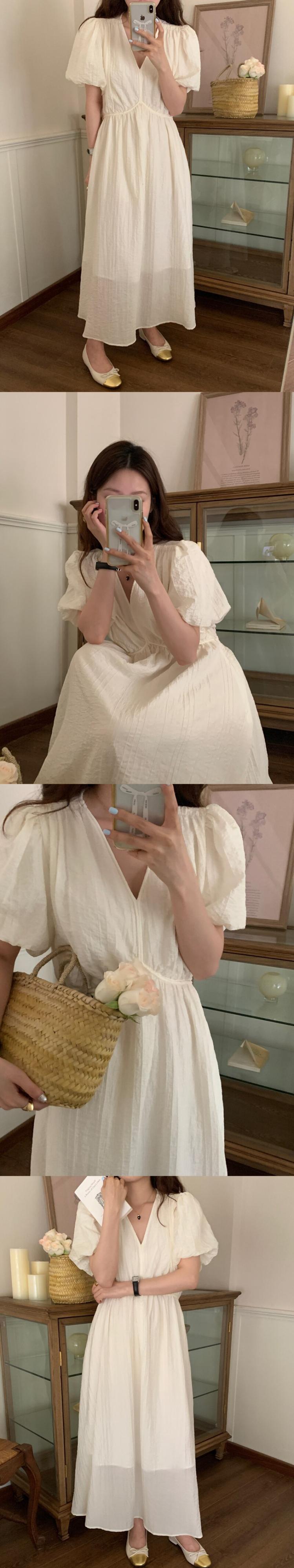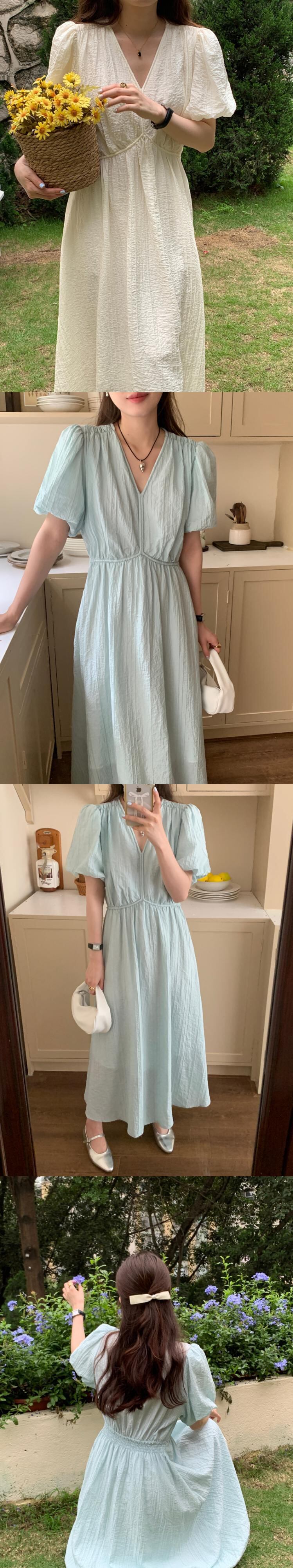 [EWQ] V ネックウエストスリムドレスカラーソリッドバブルスリーブロングドレス夏潮優しい気質ローブ サマー 夏物 Vネック ソリッドカラー