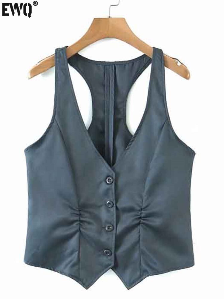 [EWQ] レディース シングルブレスト ベスト 折り目 ノースリーブ ジャケット ブラック 非対称 ルーズ 夏 潮 タンクトップ サマー 夏物