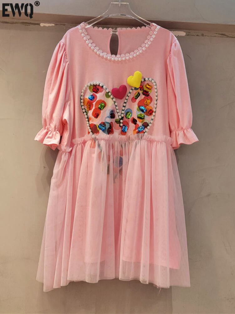[EWQ] ラブプリントダイヤモンド Tシャツ裾メッシュスプライスコントラストカラールーズレディース半袖夏潮 Tシャツ ショート ハーフスリーブ サマー 夏物