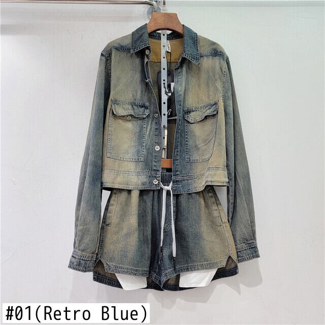 [EWQ] グラデーション ツーピース スーツ 長袖 デニム ジャケット + ウエスト レースアップ ストリート ジーンズ ショートパンツ 夏潮 ロング サマー 夏物 ショーツ ブルマー