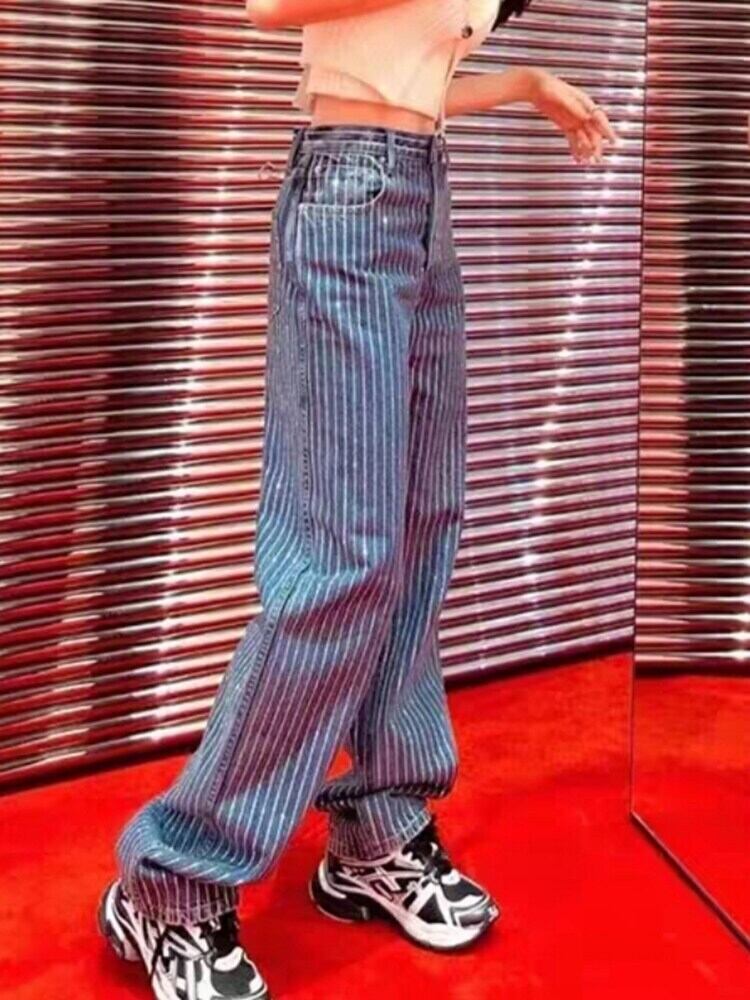 [EWQ] ストライプダイヤモンドパンツストリートウエストポケット 1 ボタンワイドレッグパンツ夏 16U641 サマー 夏物 ワイドパンツ