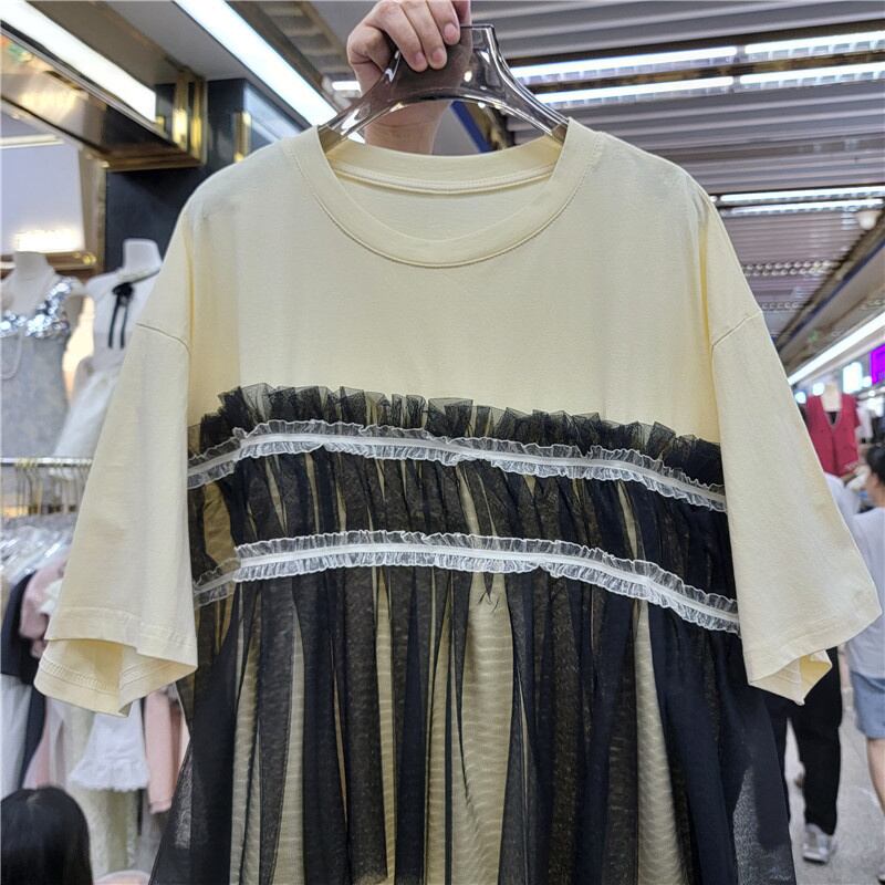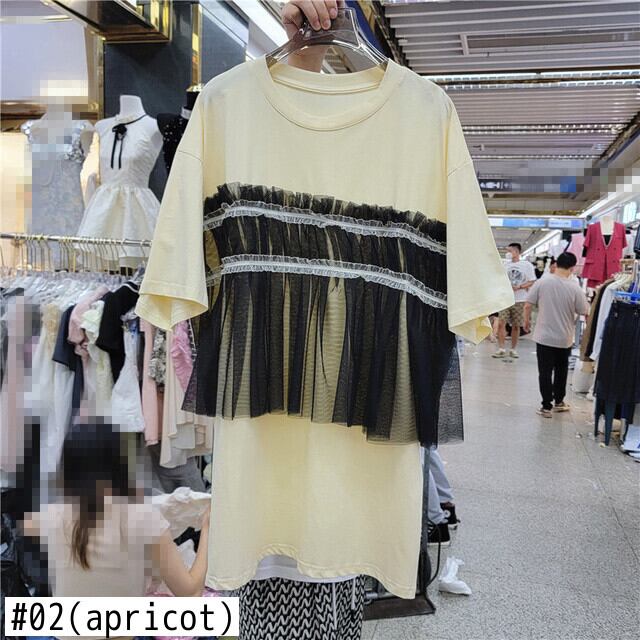 [EWQ] メッシュパッチワーク T シャツドレスルーズ半袖コントラスト O ネックドレス夏潮 Vestido 16U583 ショート ハーフスリーブ サマー 夏物 Oネック Tシャツ