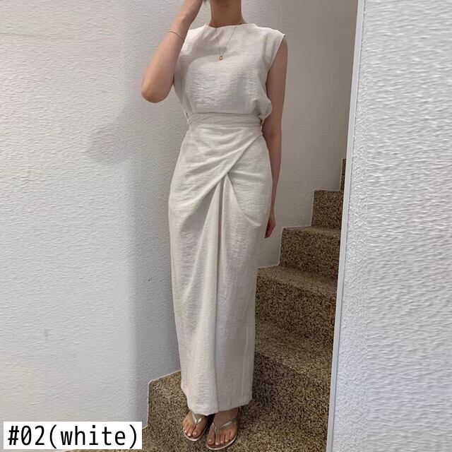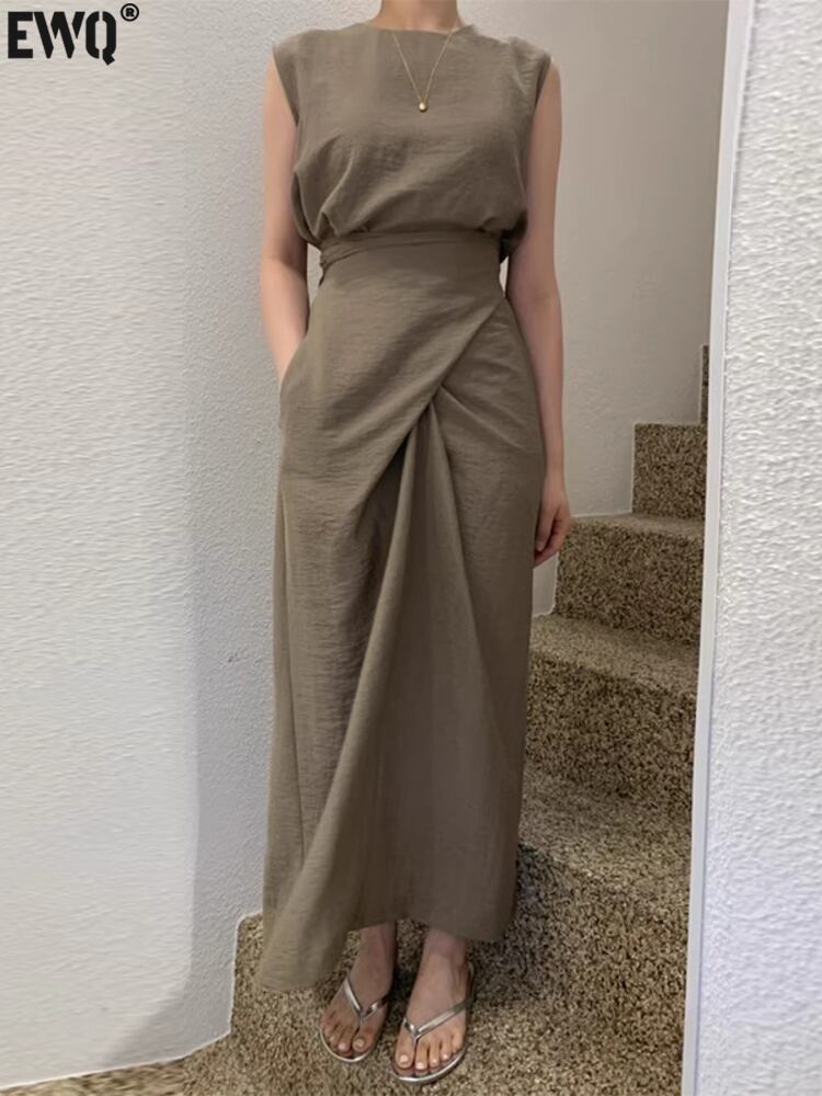 [EWQ] ホワイトスーツノースリーブベスト + ハイウエストクロス包帯ミッドカーフスカート夏潮セット 88 ハイウェスト サマー 夏物