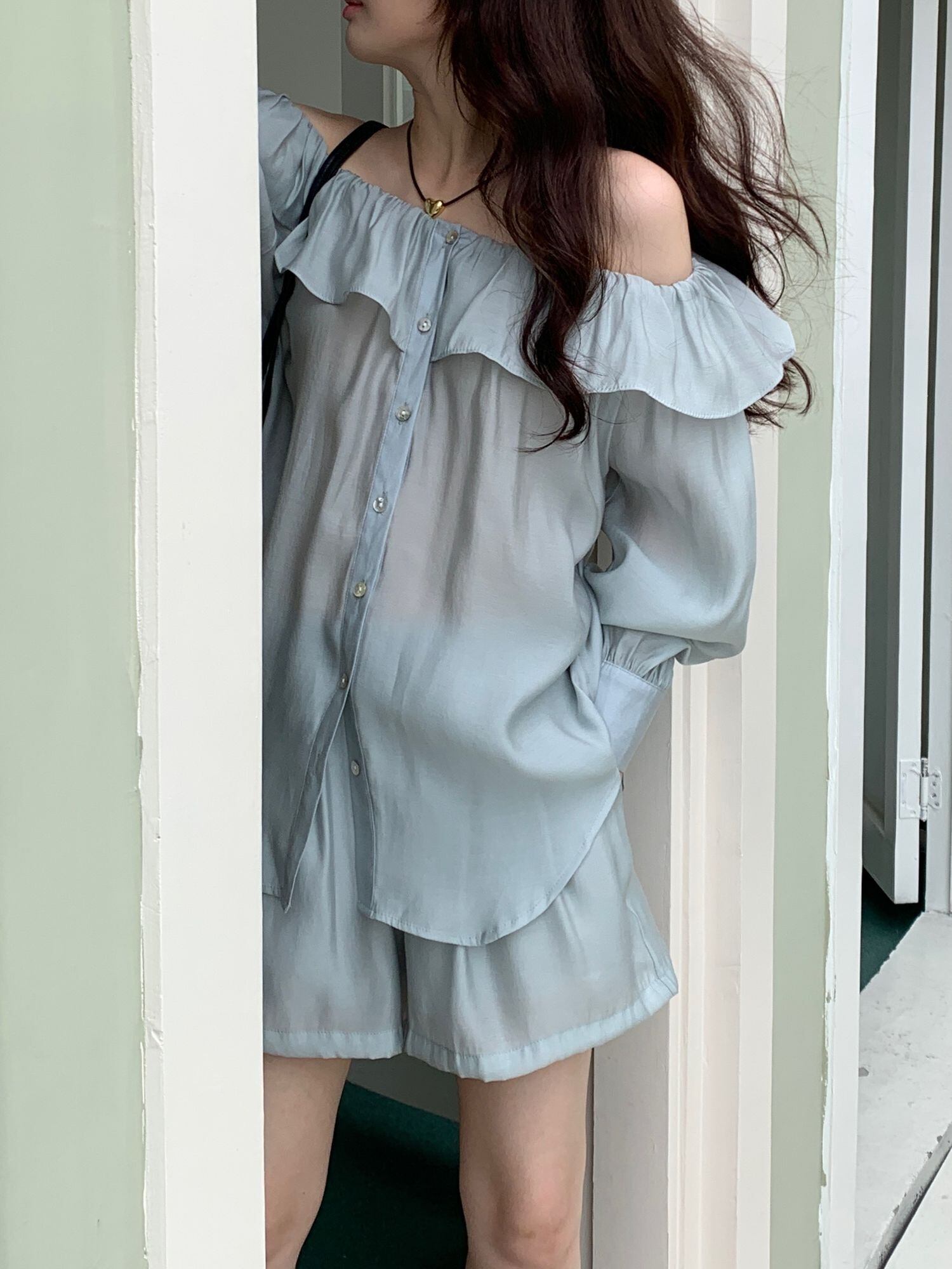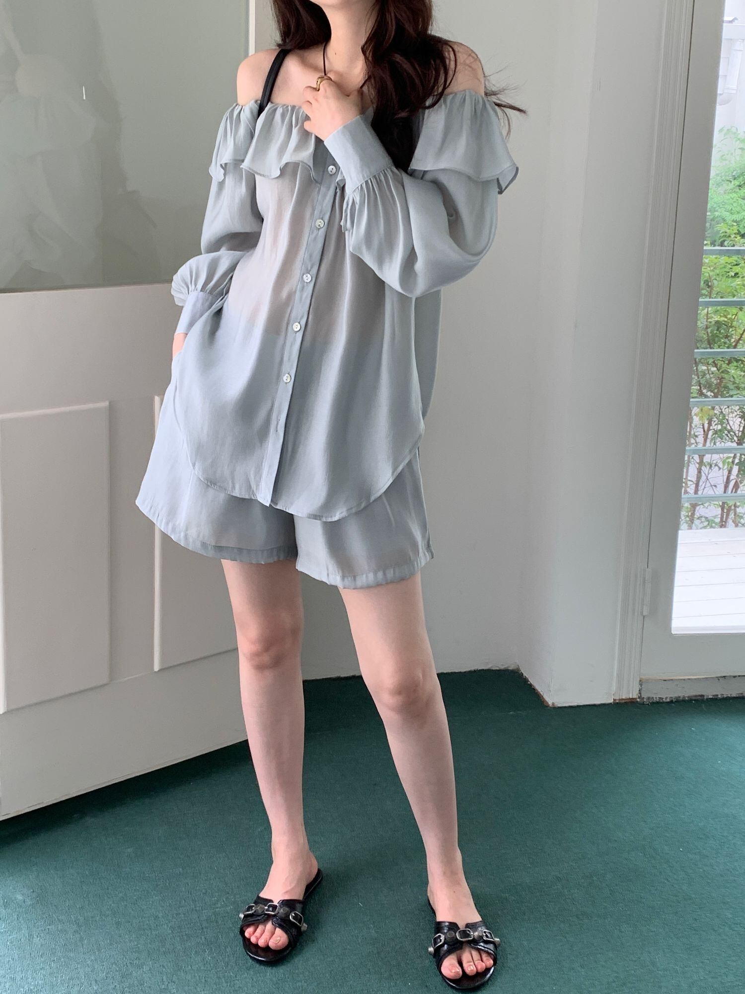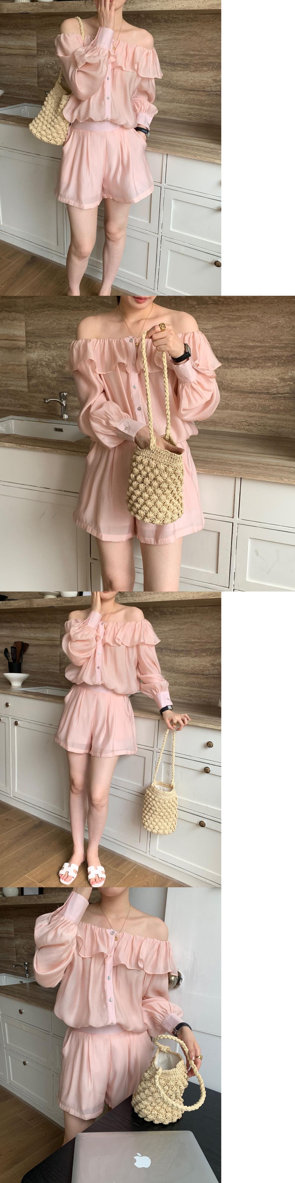 [EWQ] 甘いツーピーススーツワンショルダーピンクシャツ + ウエスト弾性ショーツ夏潮スーツ 82 エラスティック 伸縮 大人ガーリー スウィート キュート カジュアル サマー 夏物 ブルマー