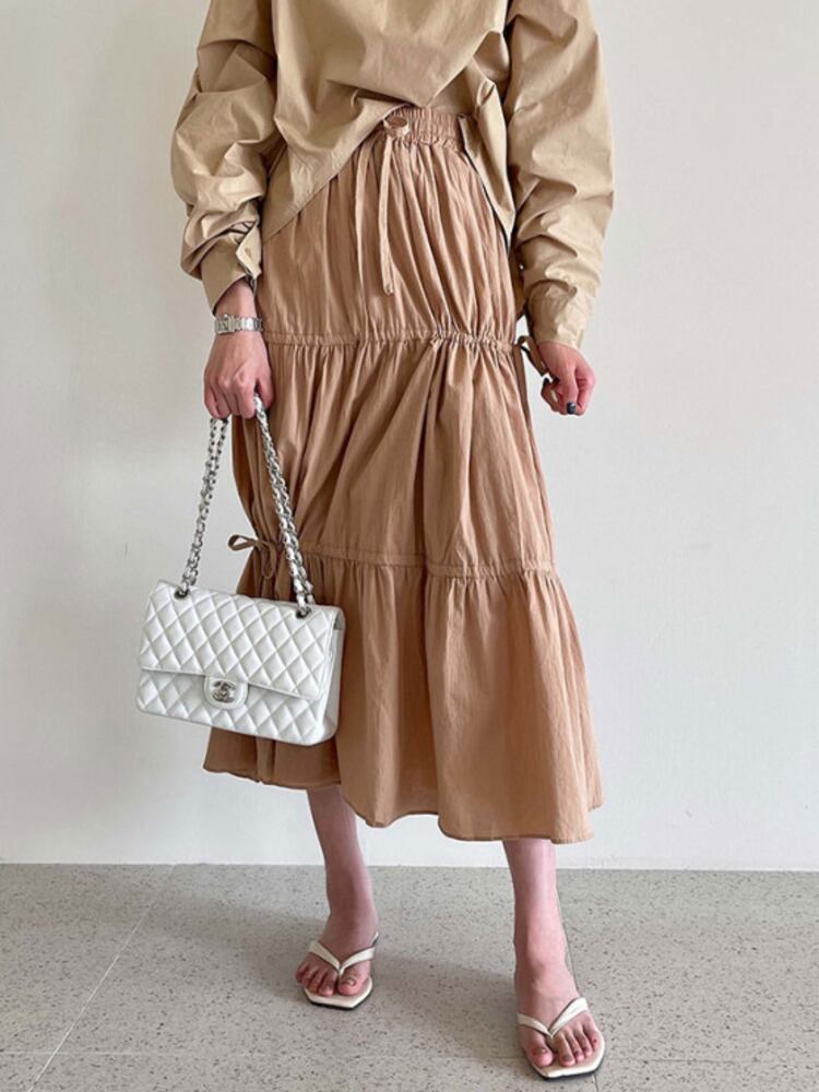 [EWQ] スリムプリーツ巾着スカートブルーウエスト弾性ミッドカーフスカート夏潮ファルダス エラスティック 伸縮 サマー 夏物