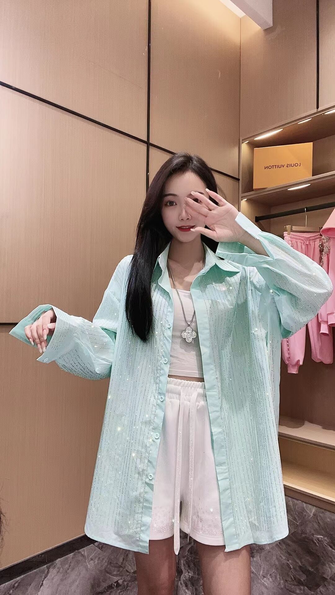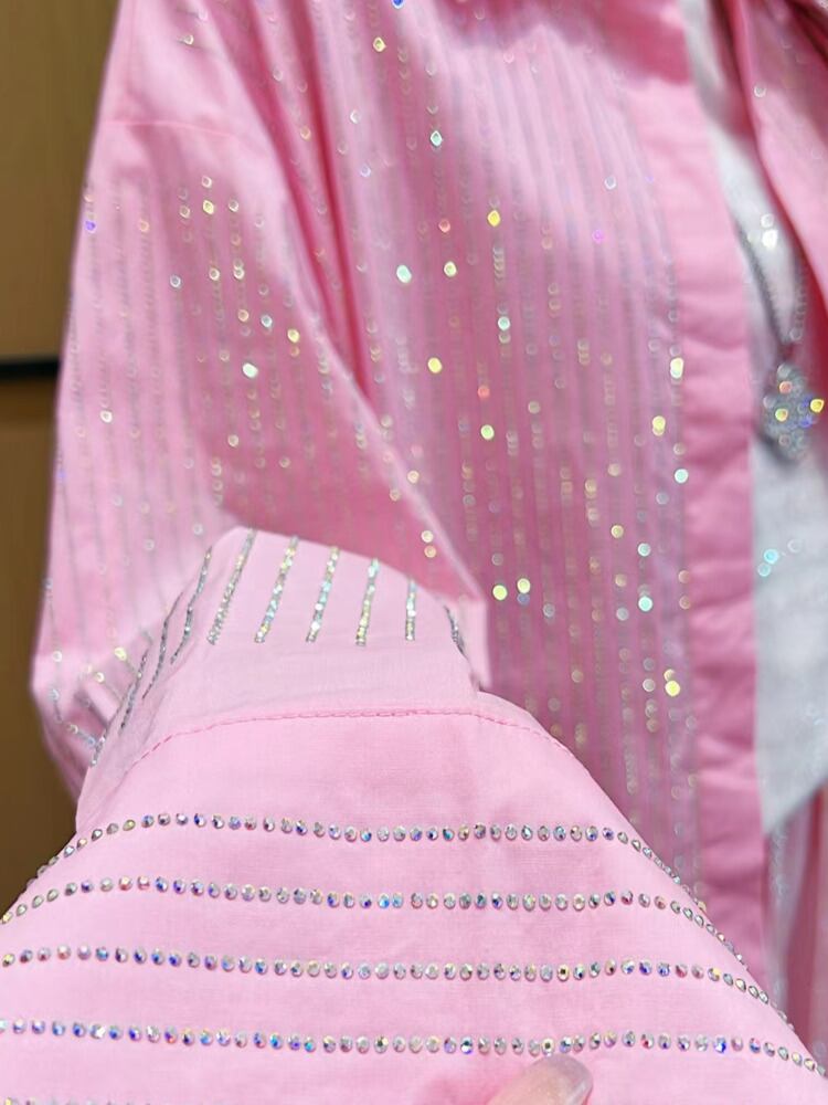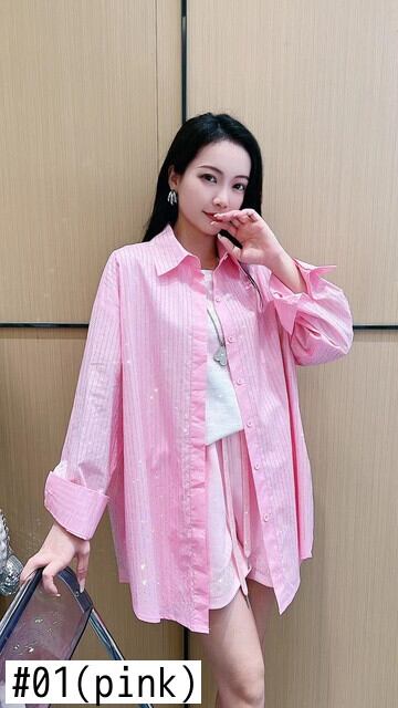 [EWQ] ダイヤモンドストライプピンクシャツシングルブレストルーズ長袖気質夏潮トップ ロング サマー 夏物