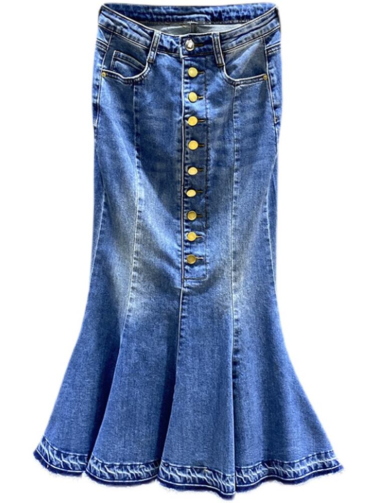 [EWQ] シングルブレストウエストデニムスカート夏潮スリムフィットラップヒップフィッシュテールミッドカーフスカートブルー サマー 夏物
