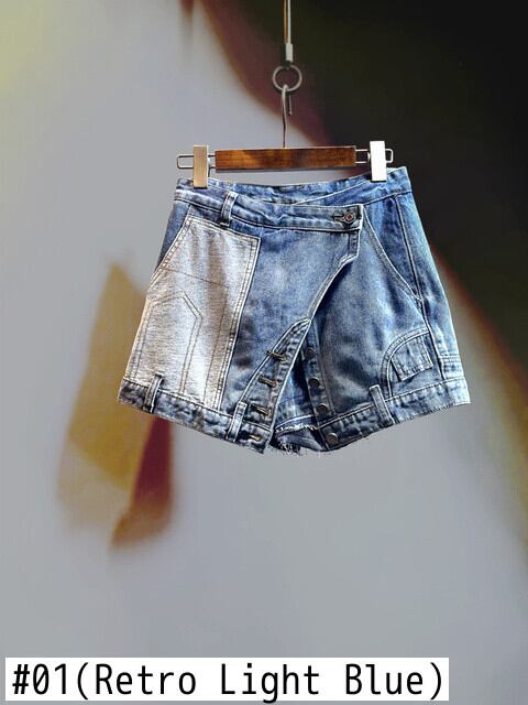[EWQ] ウエストラップヒップデニムスカート不規則パッチワークフェイクツーピースシックボタンミニスカート夏潮 サマー 夏物
