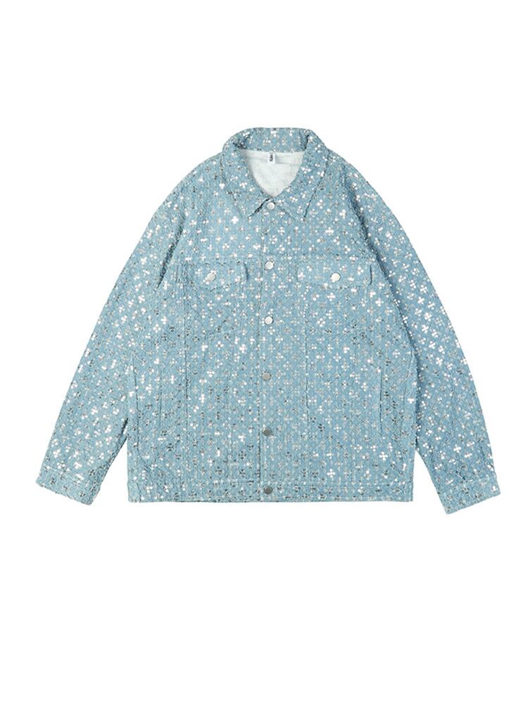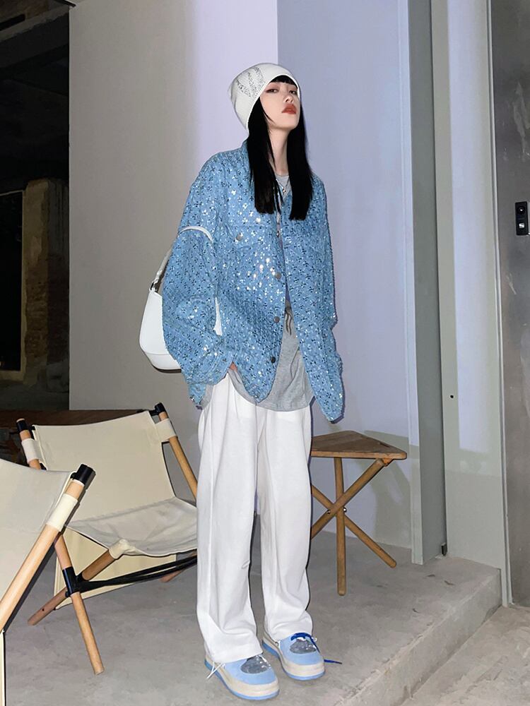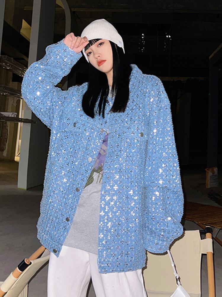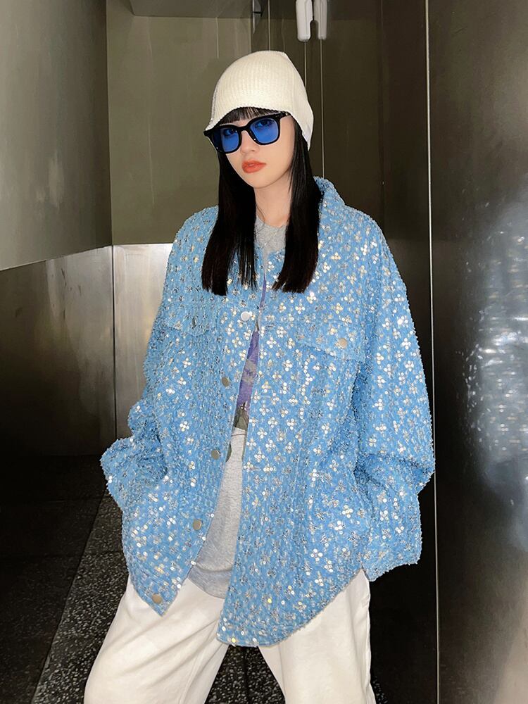 [EWQ] ルーズフィットブルースパンコールビッグサイズシャイニングジャケットラペル長袖コート潮春秋 16R311505 ロング スプリング 春物 オータム 秋物