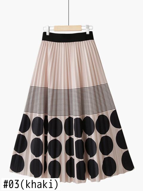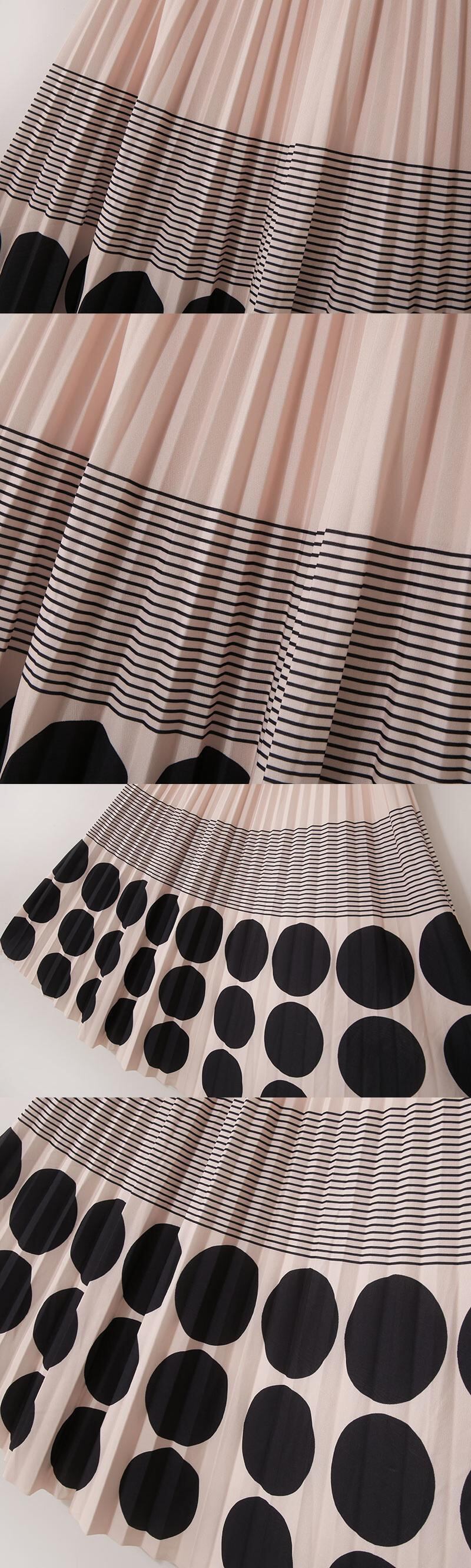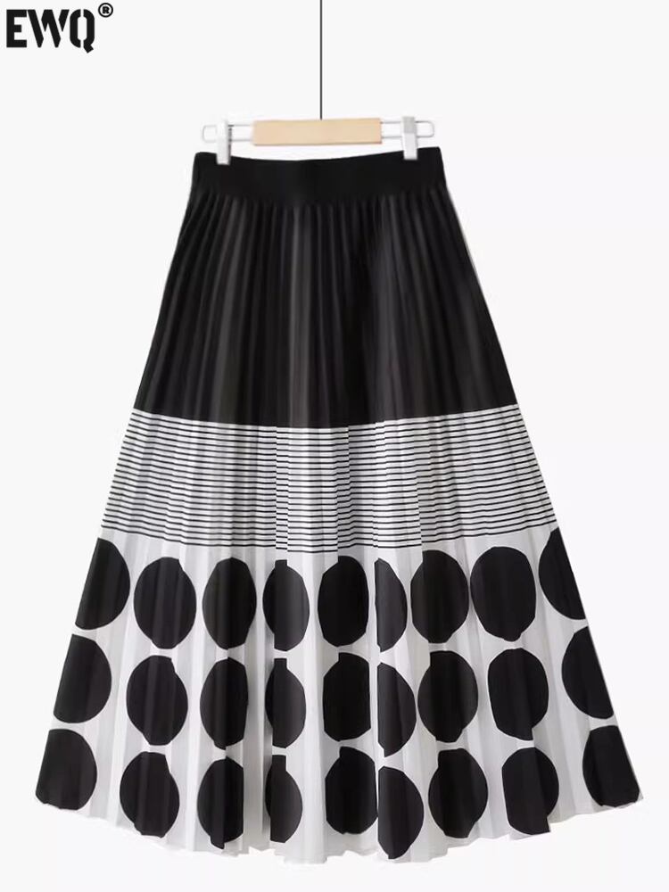 [EWQ] 弾性ウエストスカートコントラストドットプリントストライプ気質プリーツミッドカーフスカート夏潮 Y9021 エラスティック 伸縮 サマー 夏物