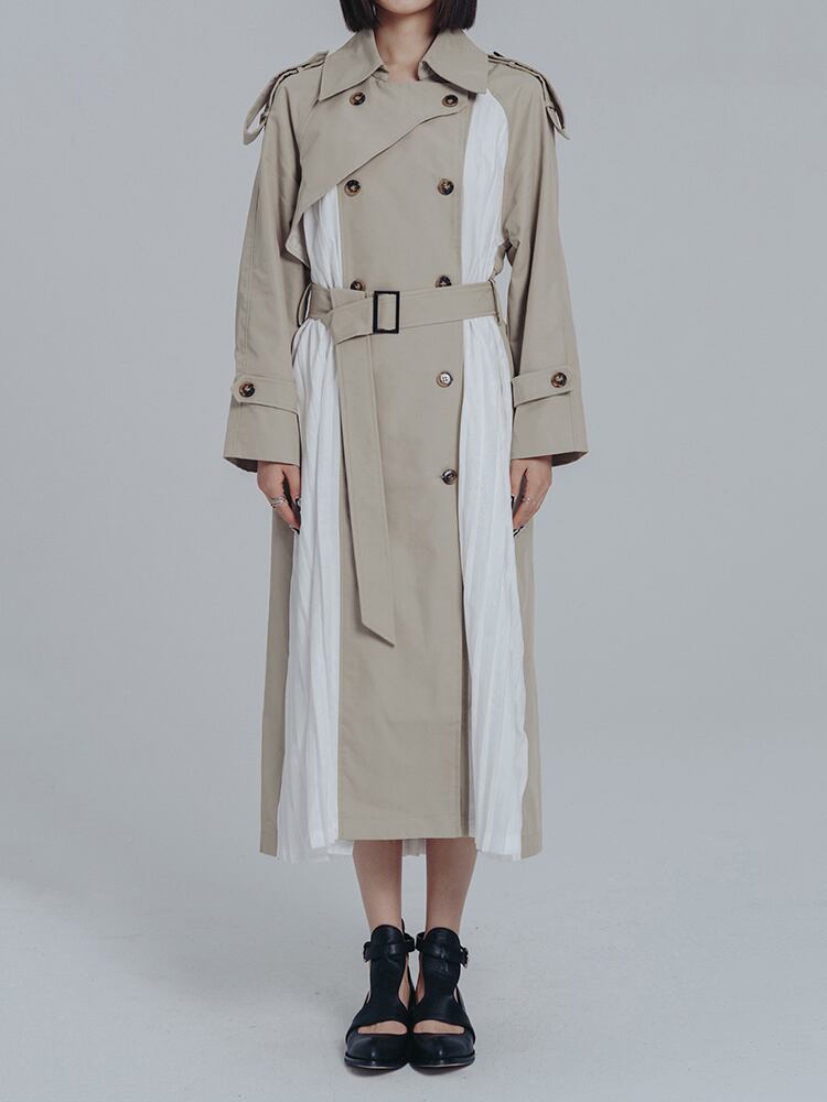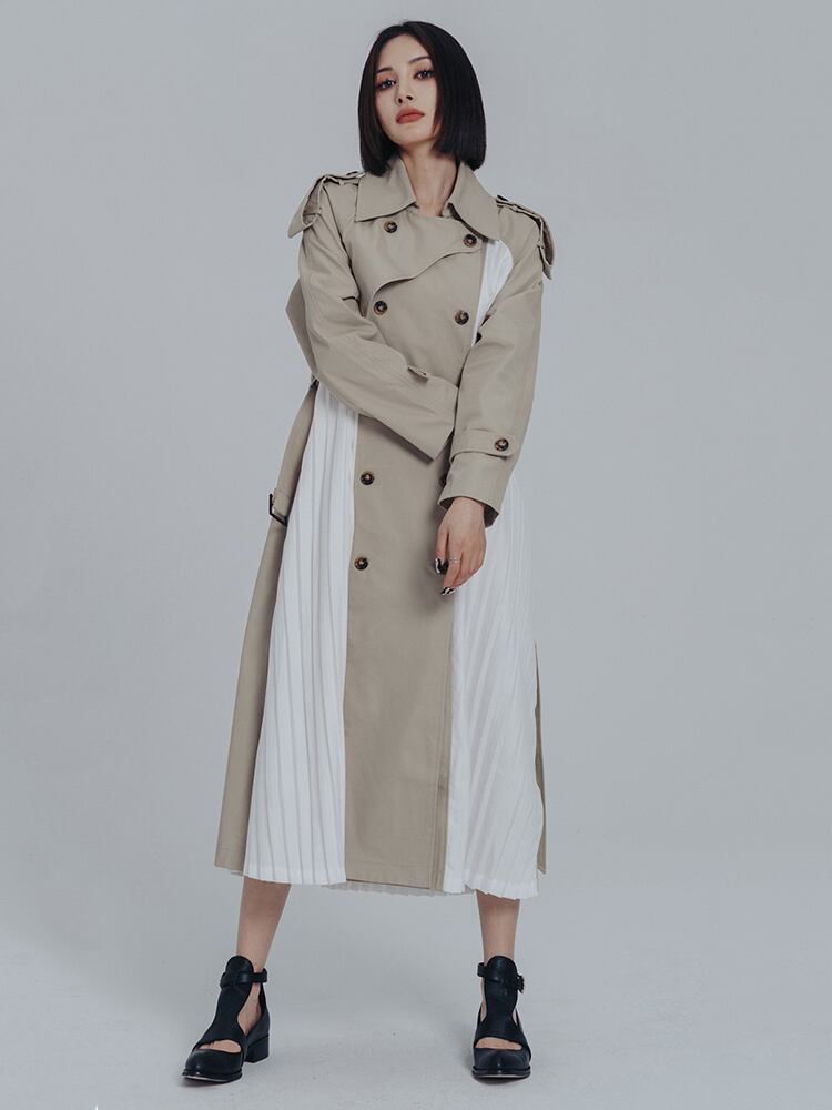 [EWQ] シックカーキプリーツビッグサイズトレンチコート生き抜く長袖ルーズパッチワークウインドブレーカー春秋 ロング スプリング 春物 オータム 秋物