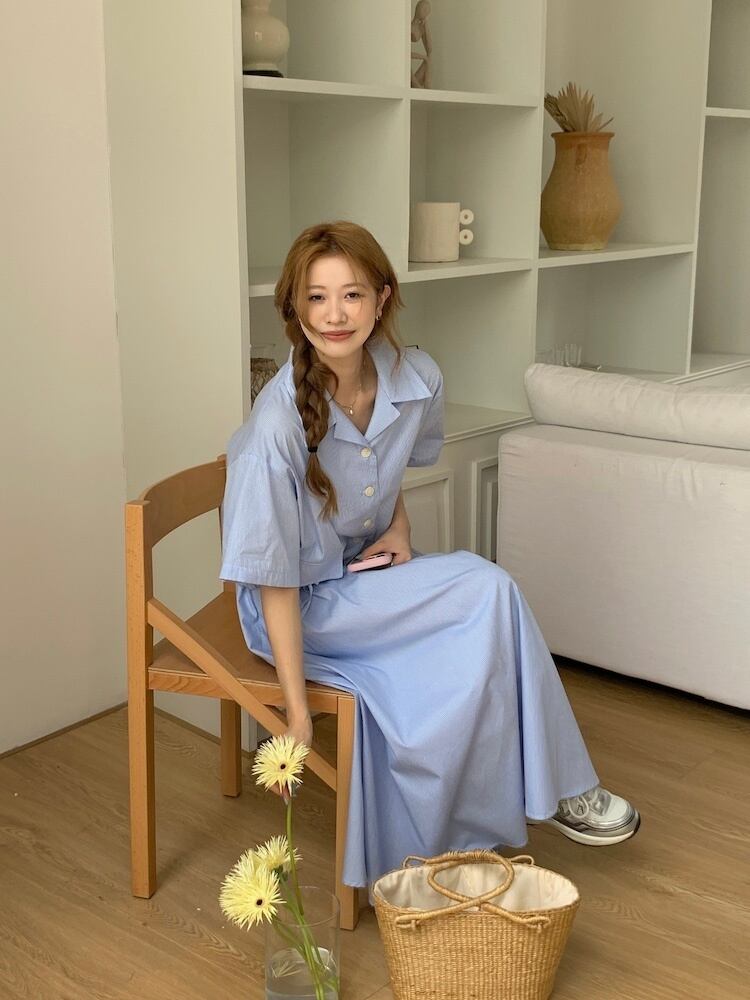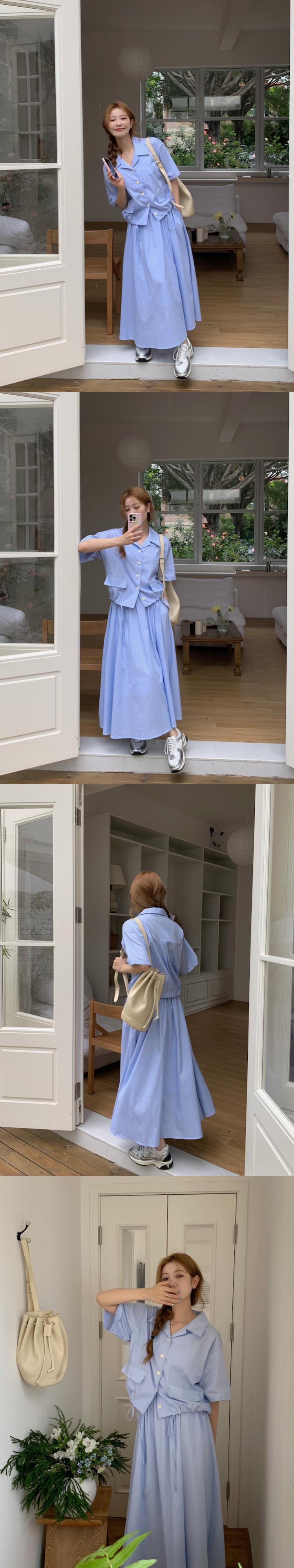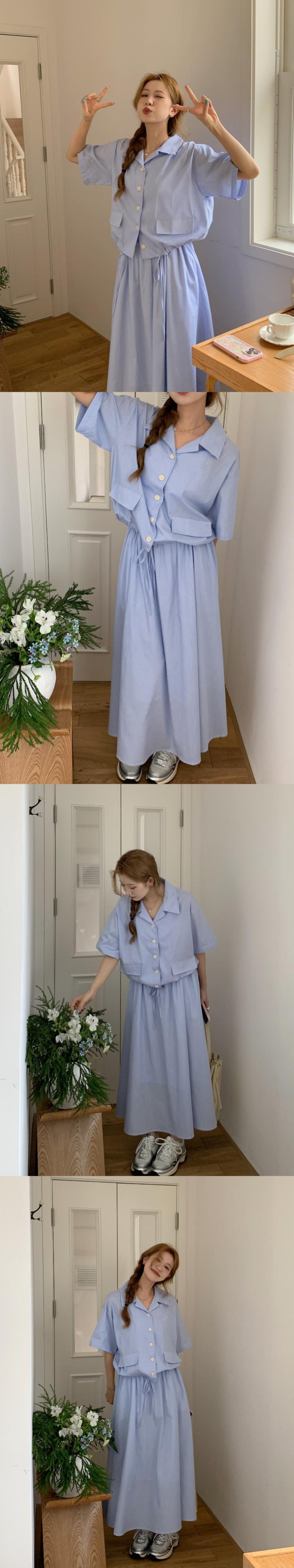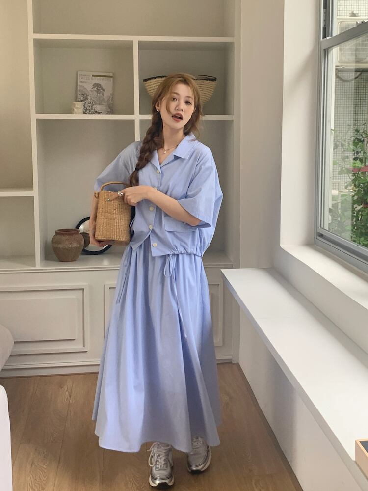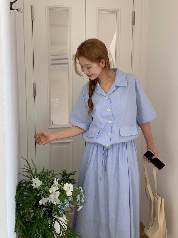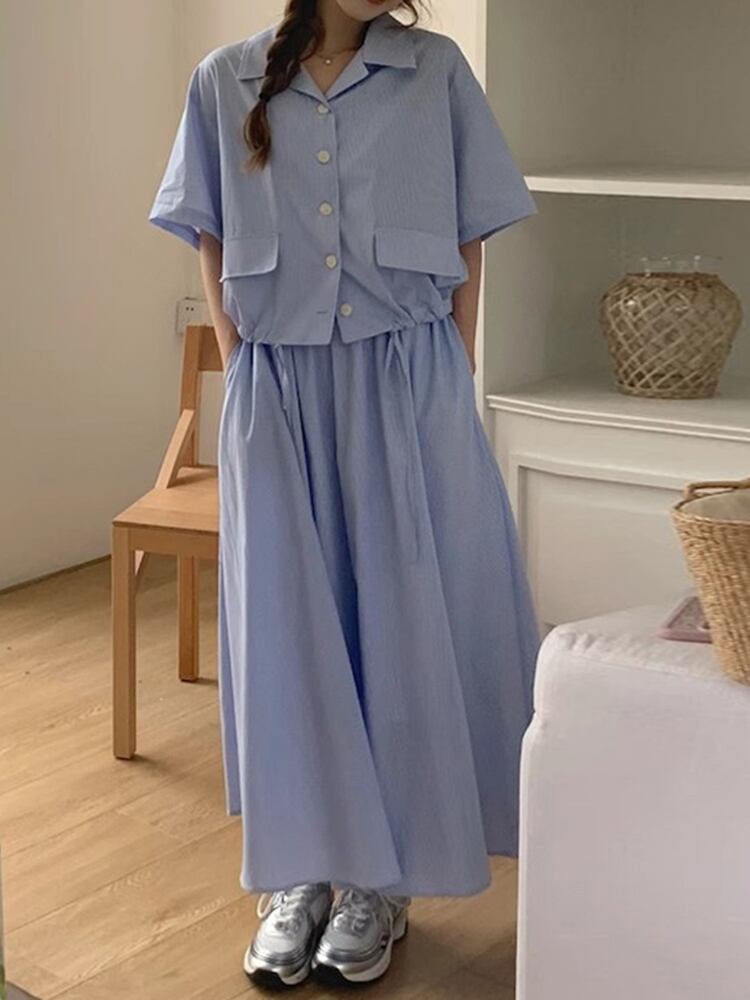 [EWQ] ブルーストライプ ダブルポケット巾着シャツ サマーウエストスカート 潮 レディース 2点セット 6U340 夏物