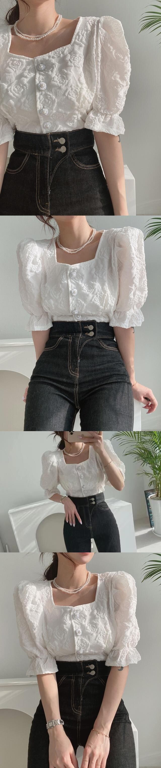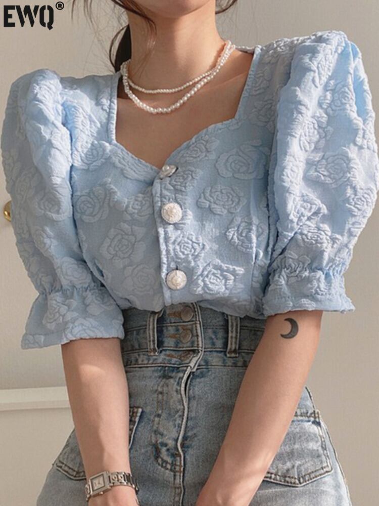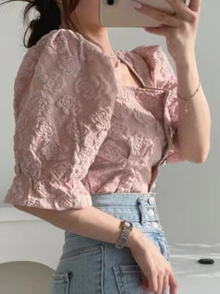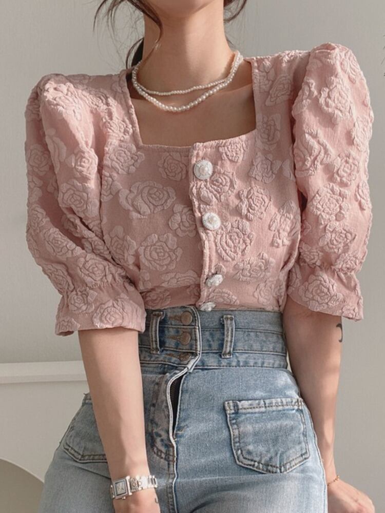 [EWQ] スクエアネック 3D フラワーシャツジャカードピンク服パールボタンパフスリーブ夏潮トップ Y9167 サマー 夏物 真珠 フラワーデザイン スクウェア