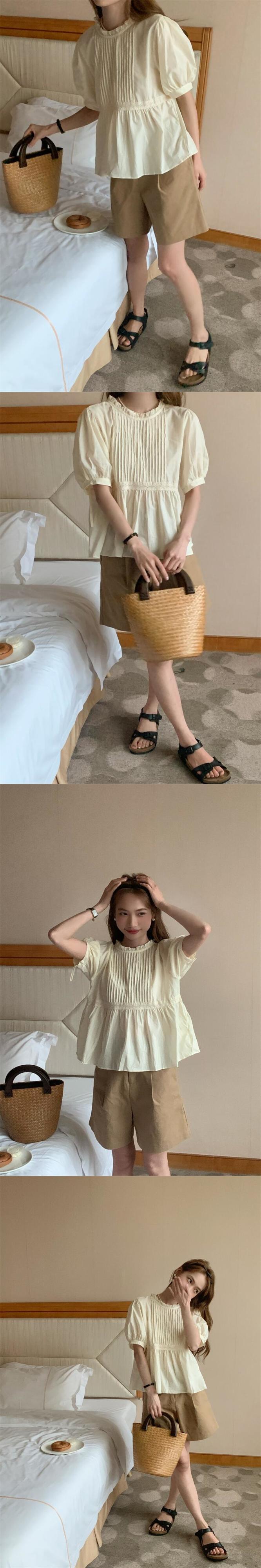 [EWQ] レーススプライスプリーツシャツバックレースアップ甘い気質パフスリーブブラウストップ夏潮 985 大人ガーリー スウィート キュート カジュアル サマー 夏物