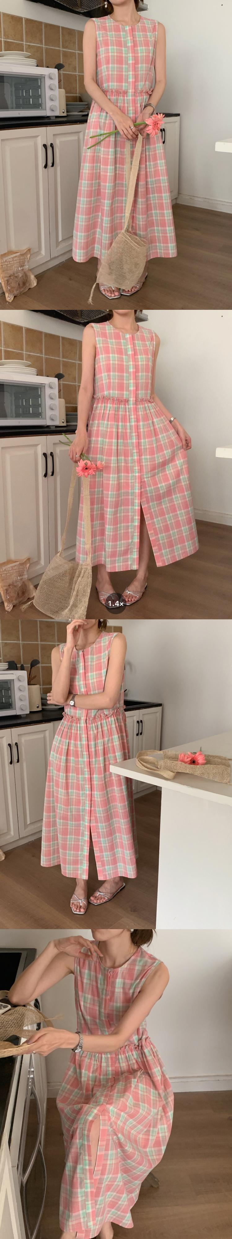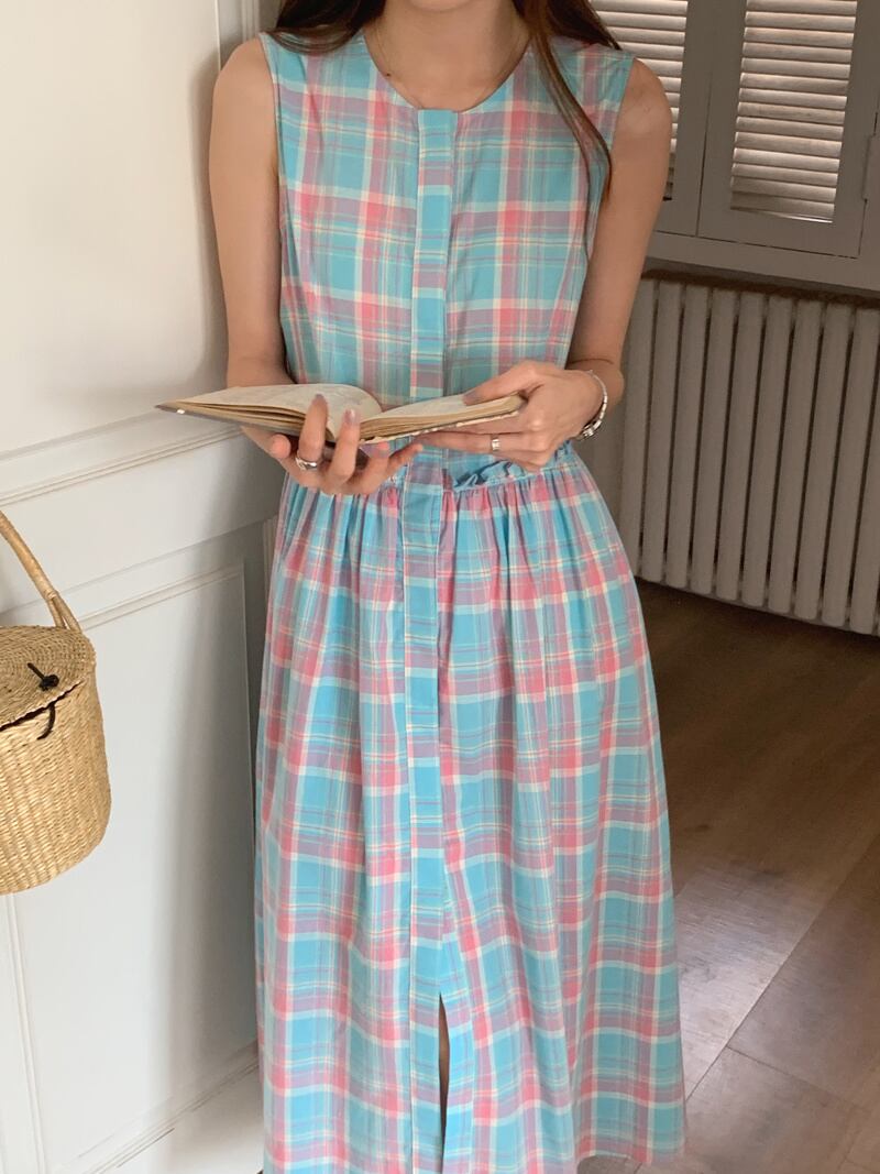 [EWQ] コントラストチェック柄フリルスプライスベストドレススプリットノースリーブ O ネックドレス夏潮 Vestido 6Y9810 サマー 夏物 Oネック