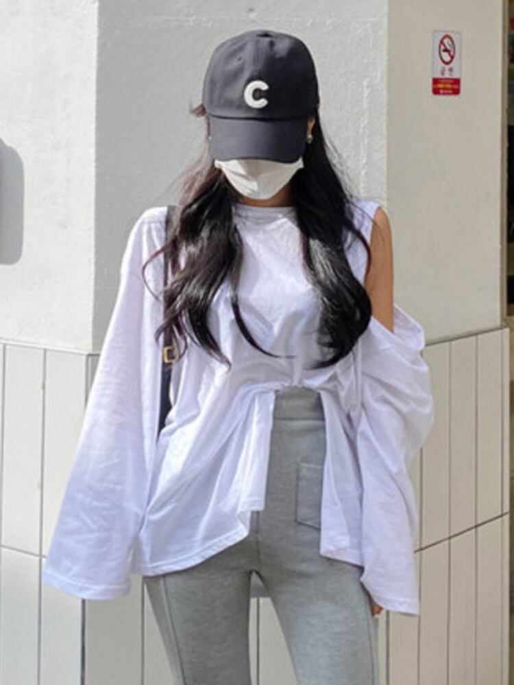 [EWQ] 白不規則オフショルダー Tシャツサイドボタンスプリット O ネックルーズフィット Tシャツトップ夏潮 ホワイト サマー 夏物 Oネック