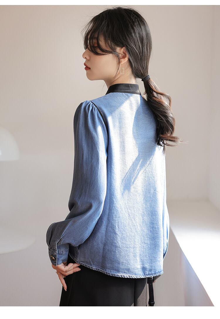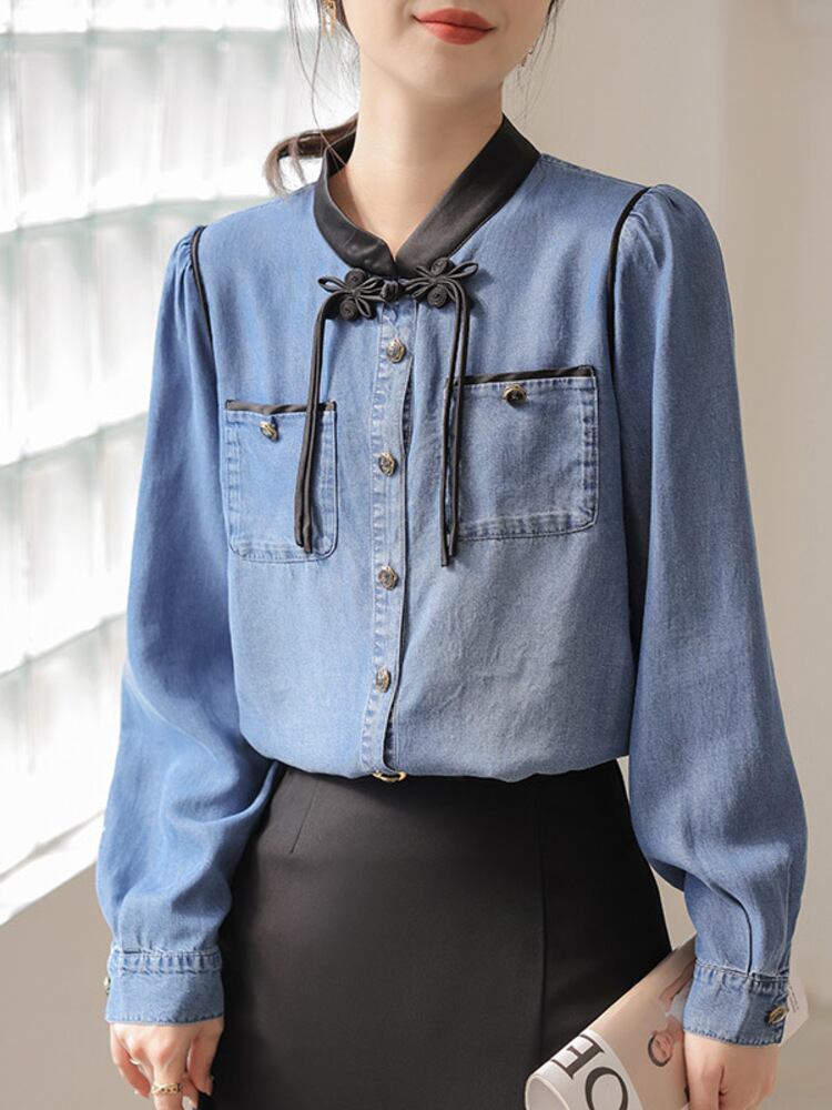 [EWQ] リボンデニムシャツポケットパッチワーク長袖ルーズシングルブレストサマートップス ロング 夏物