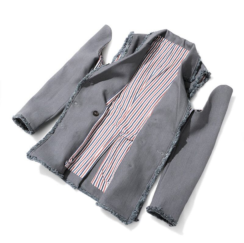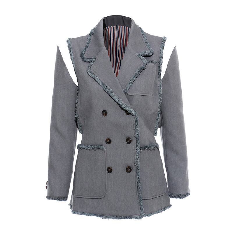 [EWQ] ストリートスタイル夏ジャケットノッチ長袖ダブルブレストテルパッチワークストライプブレザーアウター ロング サマー 夏物