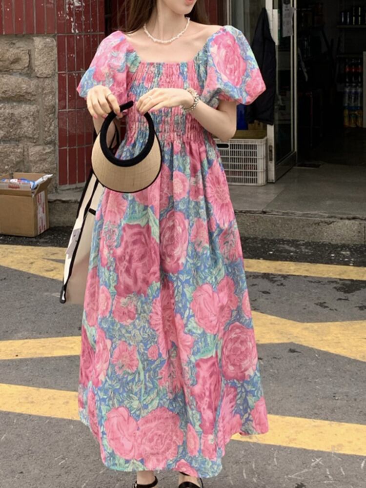 [EWQ] オフショルダープリントドレススクエアネックコントラストカラーランタンスリーブドレス夏潮 Vestido サマー 夏物 スクウェア