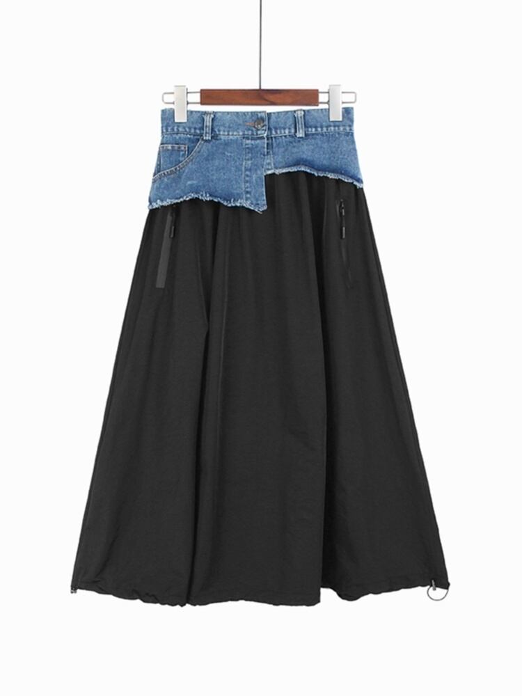 [EWQ] デニムスプライススカートパッチワークウエストストリートミッドカーフスカート夏潮服 サマー 夏物