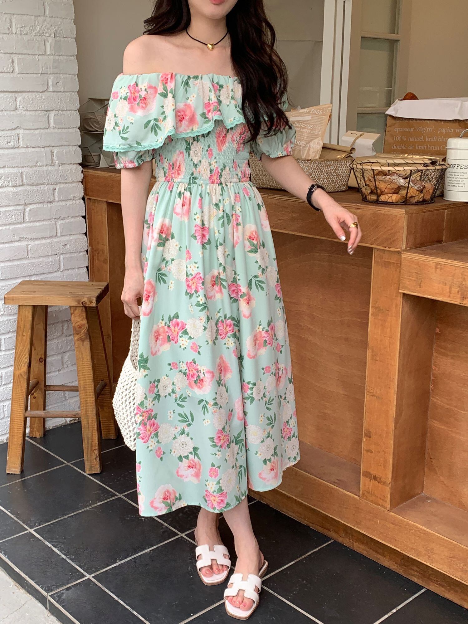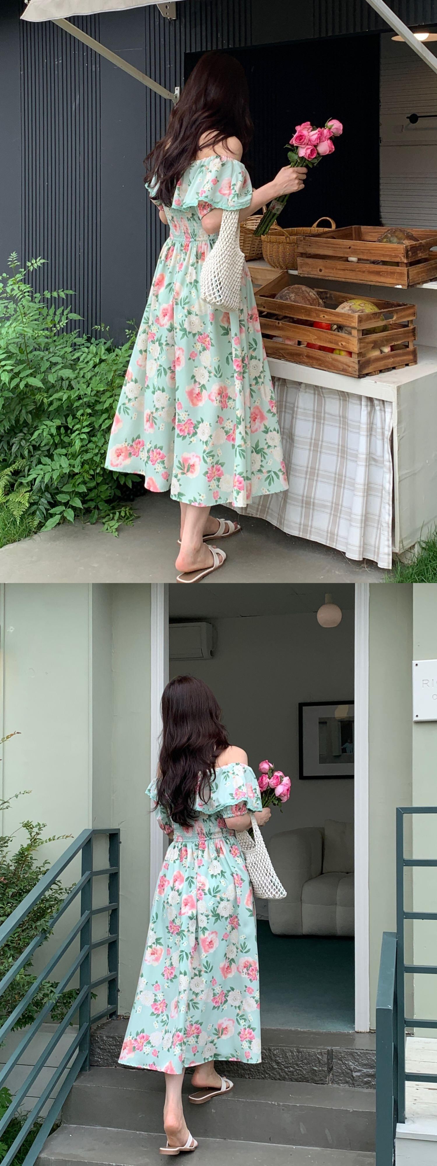 [EWQ] 甘い気質ワンショルダードレスコントラストカラープリント弾性ウエストドレス夏潮 Vestido エラスティック 伸縮 大人ガーリー スウィート キュート カジュアル サマー 夏物