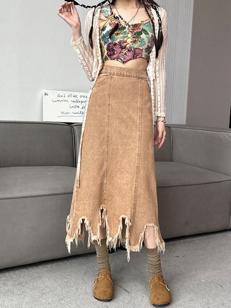[EWQ] ブラウン不規則裾テルズデニムスカートウエストポケットスリムフィットスカート夏潮服 サマー 夏物