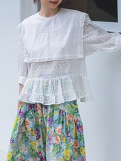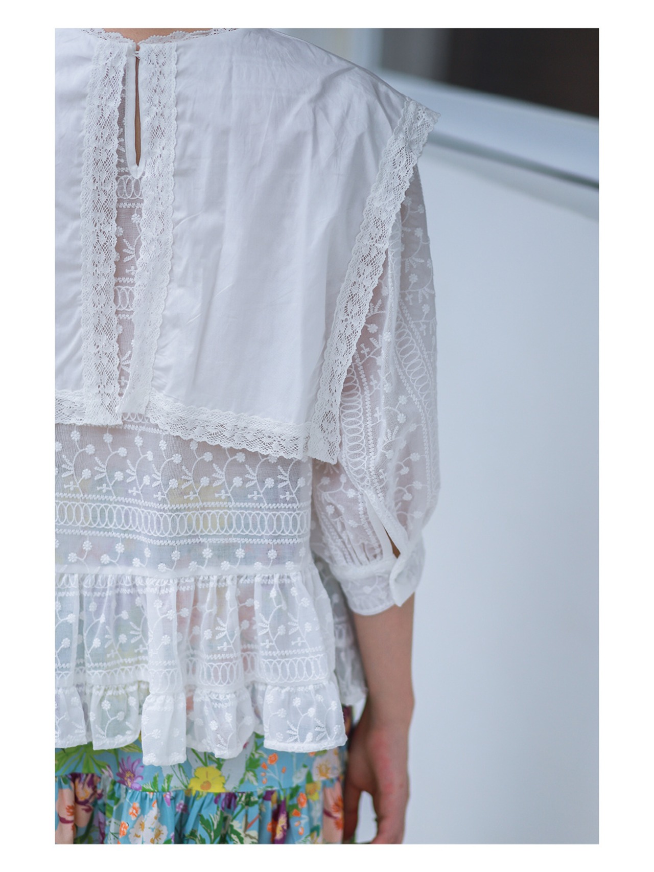 [EWQ] 刺繍フリルパッチワークシャツ半袖白 O ネックルーズフィット夏潮トップ 444 ホワイト ハーフスリーブ サマー 夏物 Oネック