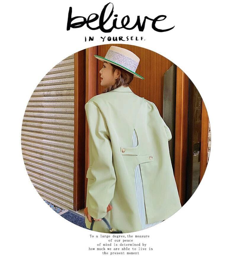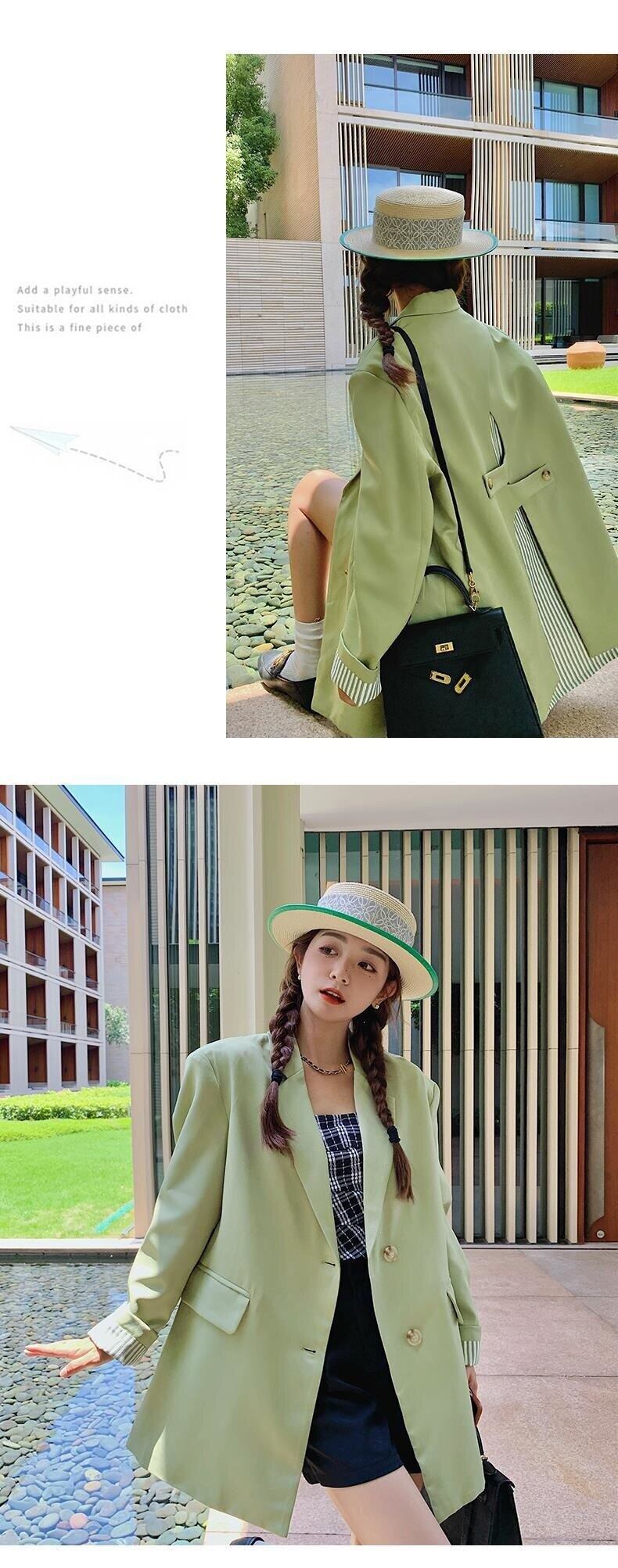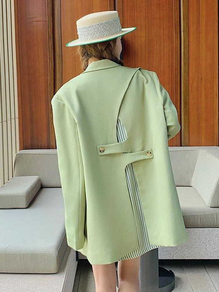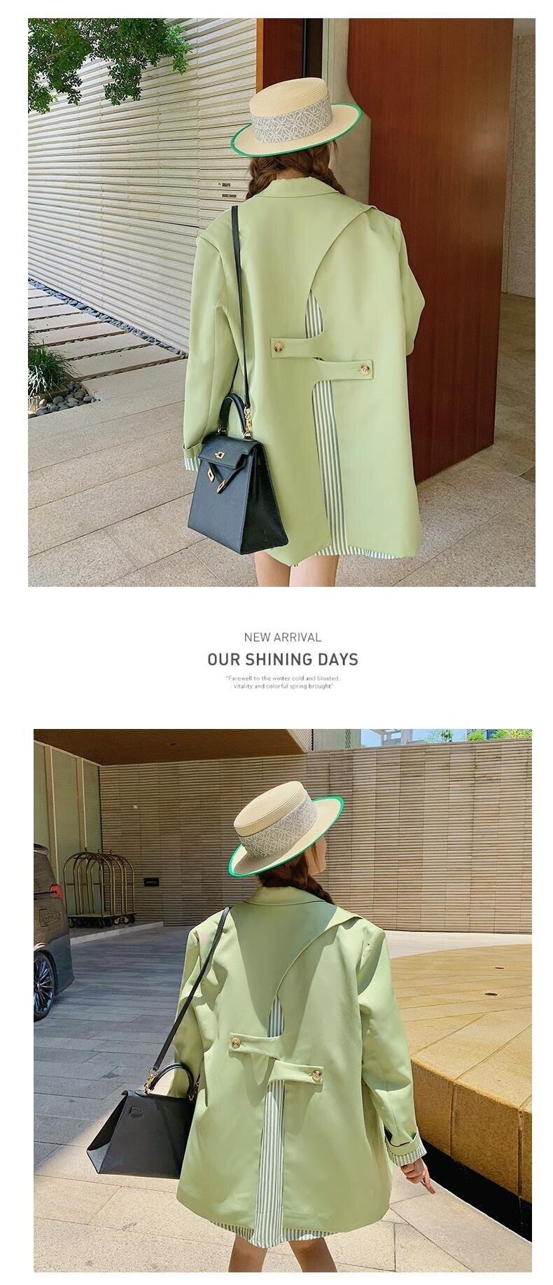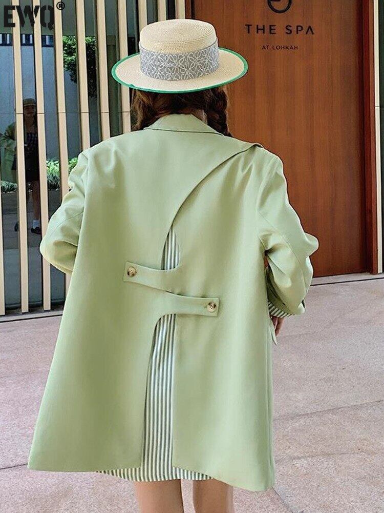 [EWQ] グリーンブレザーノッチ襟シングルブレスト長袖ストライプパッチワークスーツジャケットサマーコート 6U88 ロング 夏物