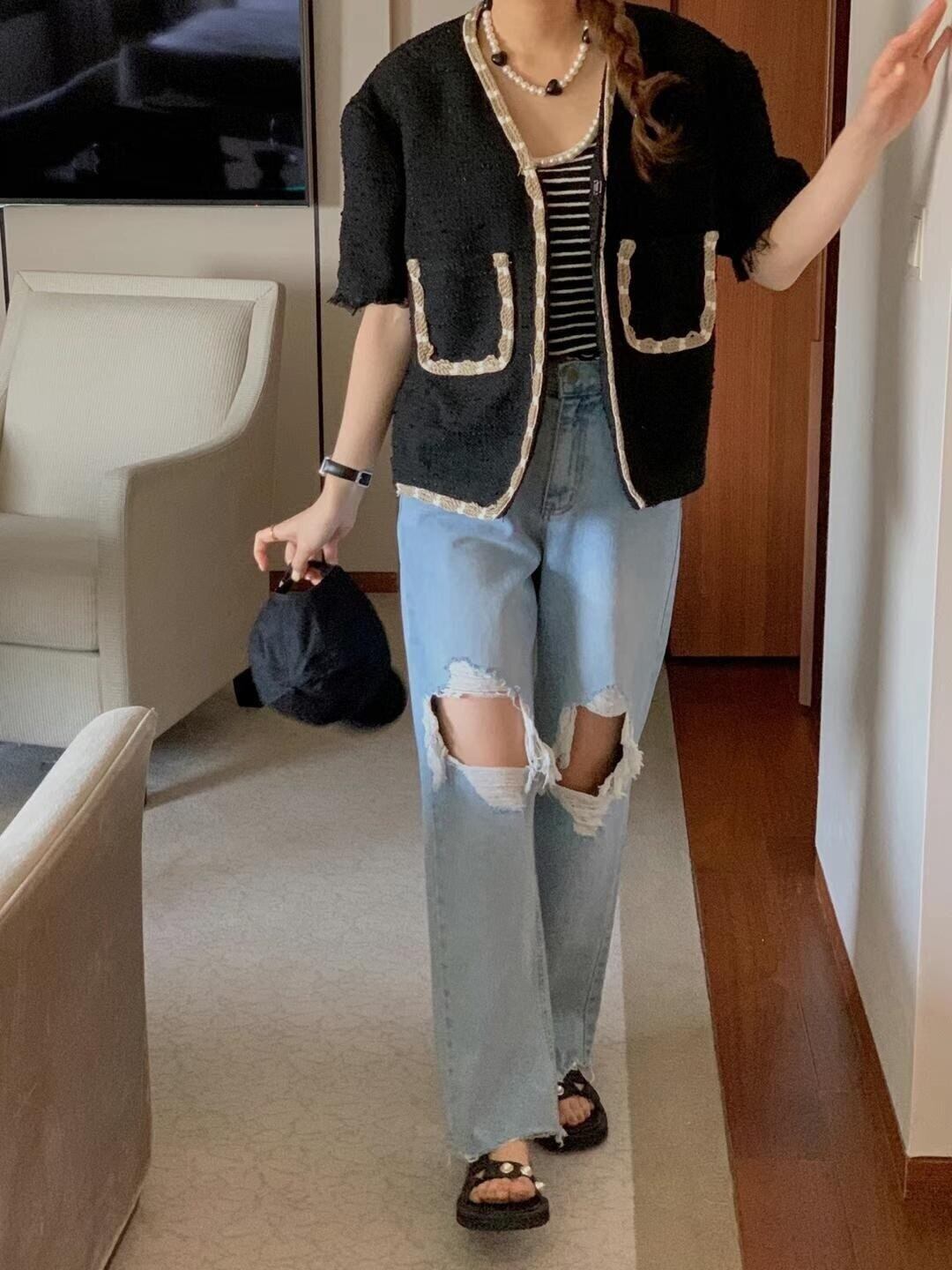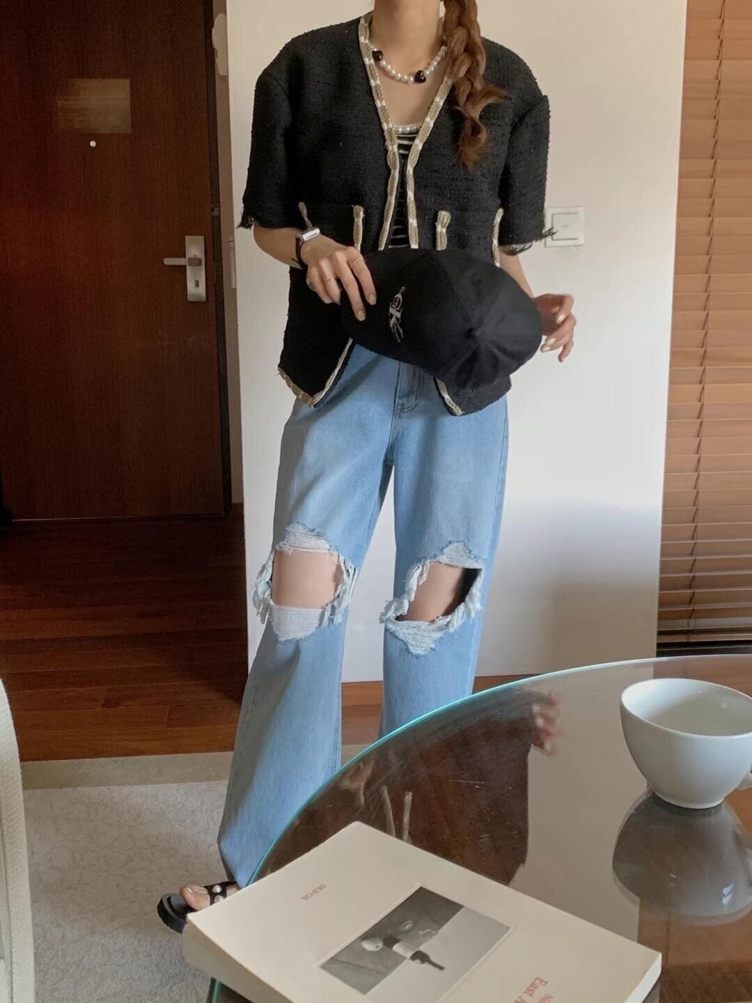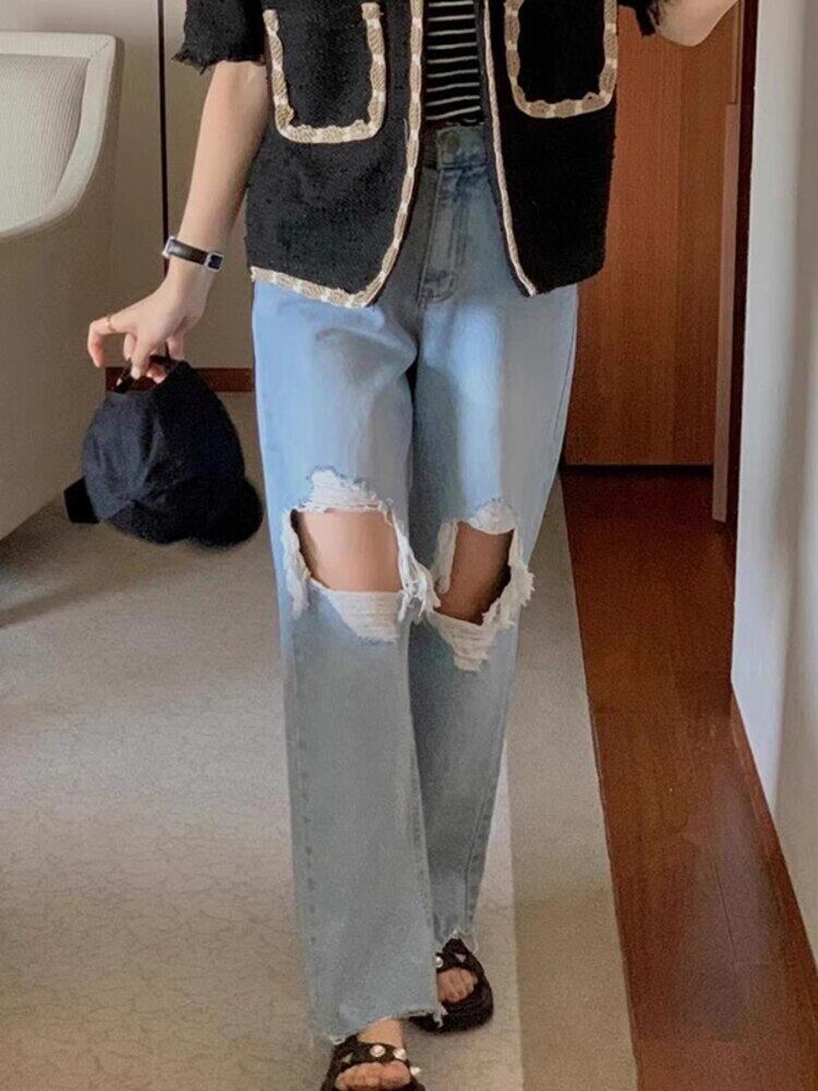 [EWQ] ブルーデニムパンツ摩耗ウエストポケットストリートジーンズ夏潮ワイドレッグパンツ サマー 夏物 ワイドパンツ