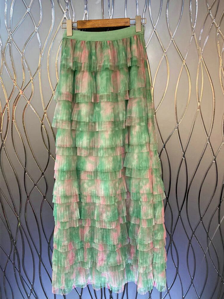[EWQ] ティアードフリルスプライスメッシュスカートウエストコントラストカラーミッドカーフスカート夏潮 U85 レッド サマー 夏物