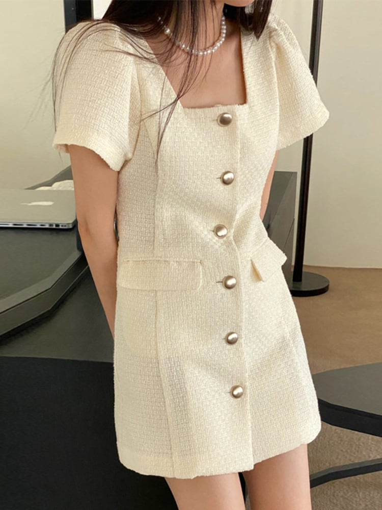 [EWQ] スクエアネックツイードドレスメタルボタンスリムフィット半袖ミニドレス夏潮 Vestido 16Y9739 ショート ハーフスリーブ サマー 夏物 スクウェア